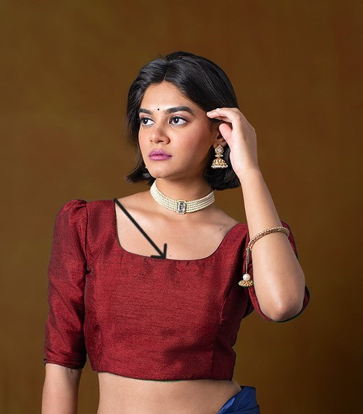 Start at the neck point (the top of your shoulder) and then use measuring tape vertically towards the point where you want the end of blouse, as the arrow shown in the image.