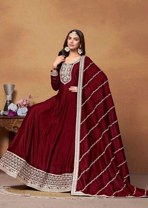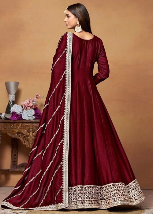 Maroon Anarkali Suit With Heavy Thread Embroidery With Sequis Work