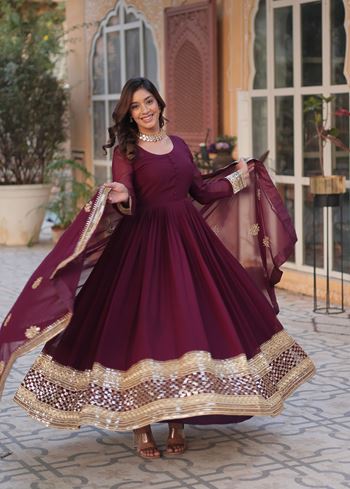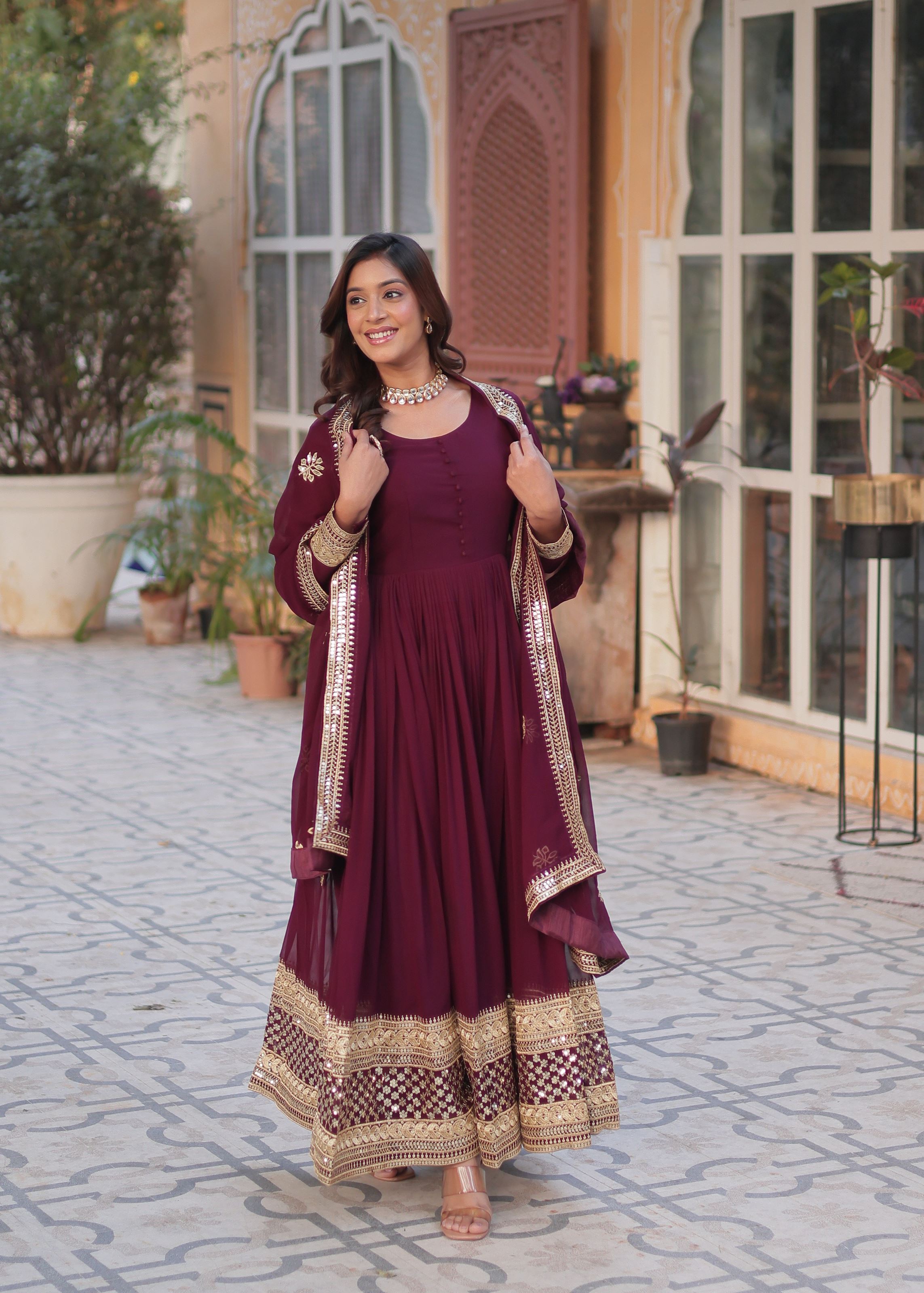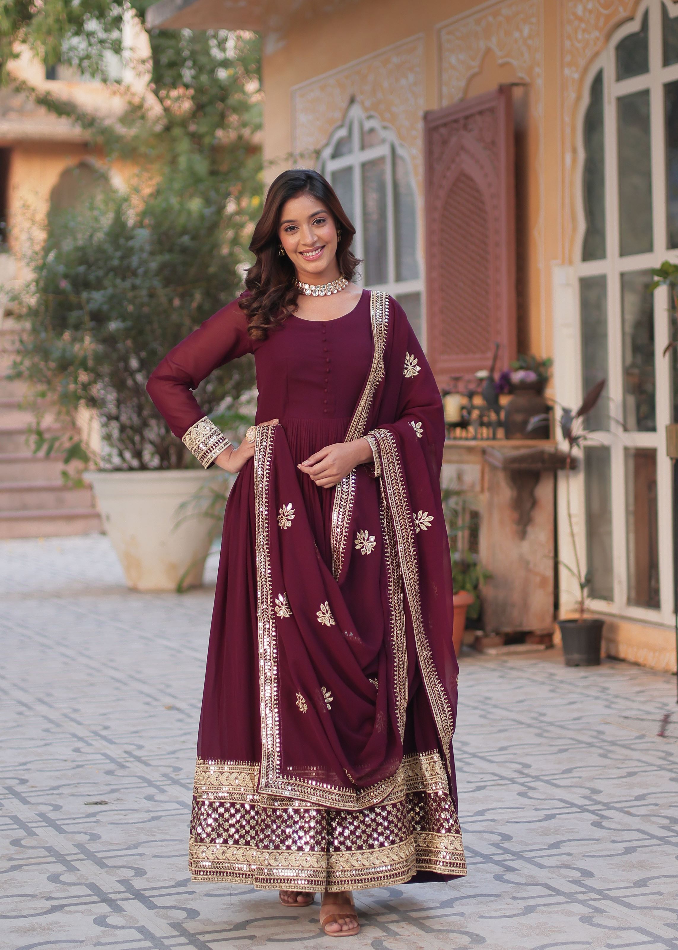 Radiate elegance in the Maroon Faux Blooming Suit With Embroidery Zari Sequins-Work, a regal ethnic outfit from Aethnofit Fashions. Made from premium faux blooming georgette, this fabric offers a flawless drape, breathable texture, and graceful movement — ideal for festive functions, weddings, or elevated everyday wear. The rich maroon shade is beautifully enhanced by intricate zari and sequins embroidery, giving the ensemble a refined traditional charm with a contemporary sparkle.