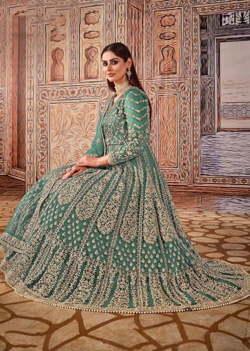 Rama Green Net Heavy Thread Embroidery And Zari Work Anarkali Suits