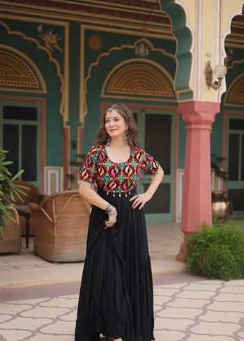 The true highlight lies in its intricate Kutchi Gamthi embroidery – a hand-stitched marvel known for its vibrant motifs and heritage detailing. Accentuated with delicate Kodi embellishments, each thread showcases the richness of Indian craftsmanship. The classic black hue provides a perfect canvas for the bold embroidery to shine, delivering a graceful yet commanding presence.