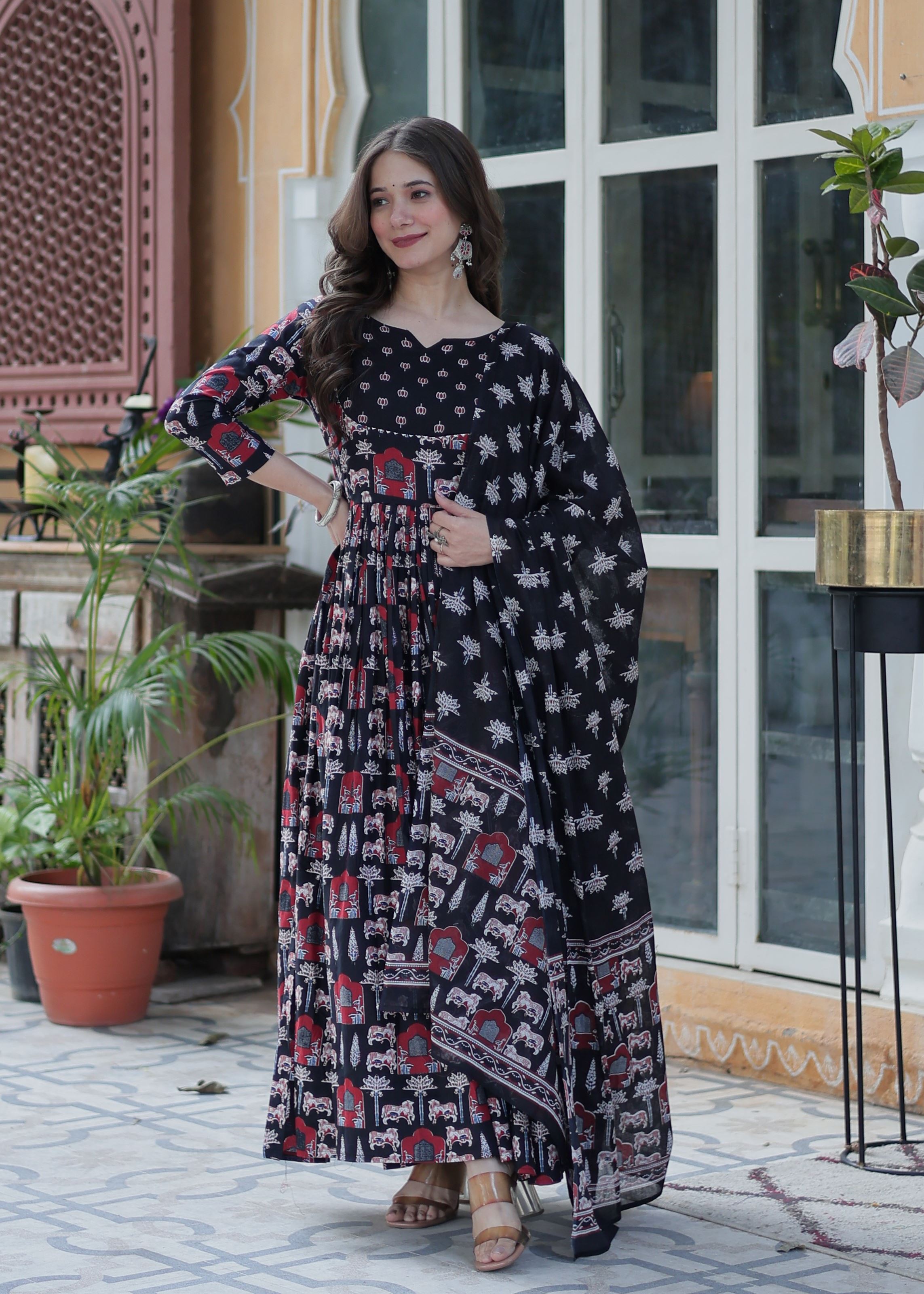 Stay effortlessly stylish with this classic Black Anarkali featuring Elegant Printed Work, exclusively from Aethnofit Fashions. Made from breathable and soft pure cotton, this 52-inch Anarkali offers unmatched comfort with a flattering flare — making it a perfect choice for everyday ethnic wear, office ensembles, or casual outings.