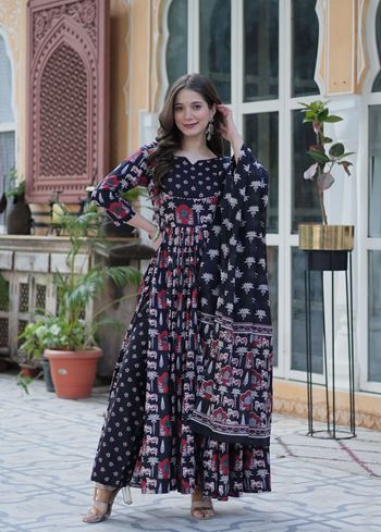 The deep black base provides a timeless backdrop to the detailed printed motifs, which add a subtle yet eye-catching charm. The lightweight fabric ensures ease of movement and day-long wearability, while the coordinated pure cotton dupatta enhances the overall aesthetic with simplicity and grace. Ideal for warm-weather dressing or minimalistic fashion lovers, this Anarkali is a wardrobe essential that combines utility with ethnic flair.