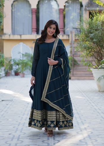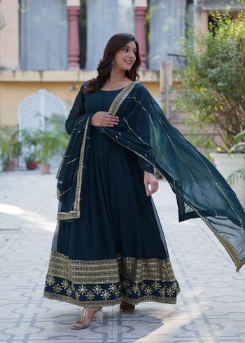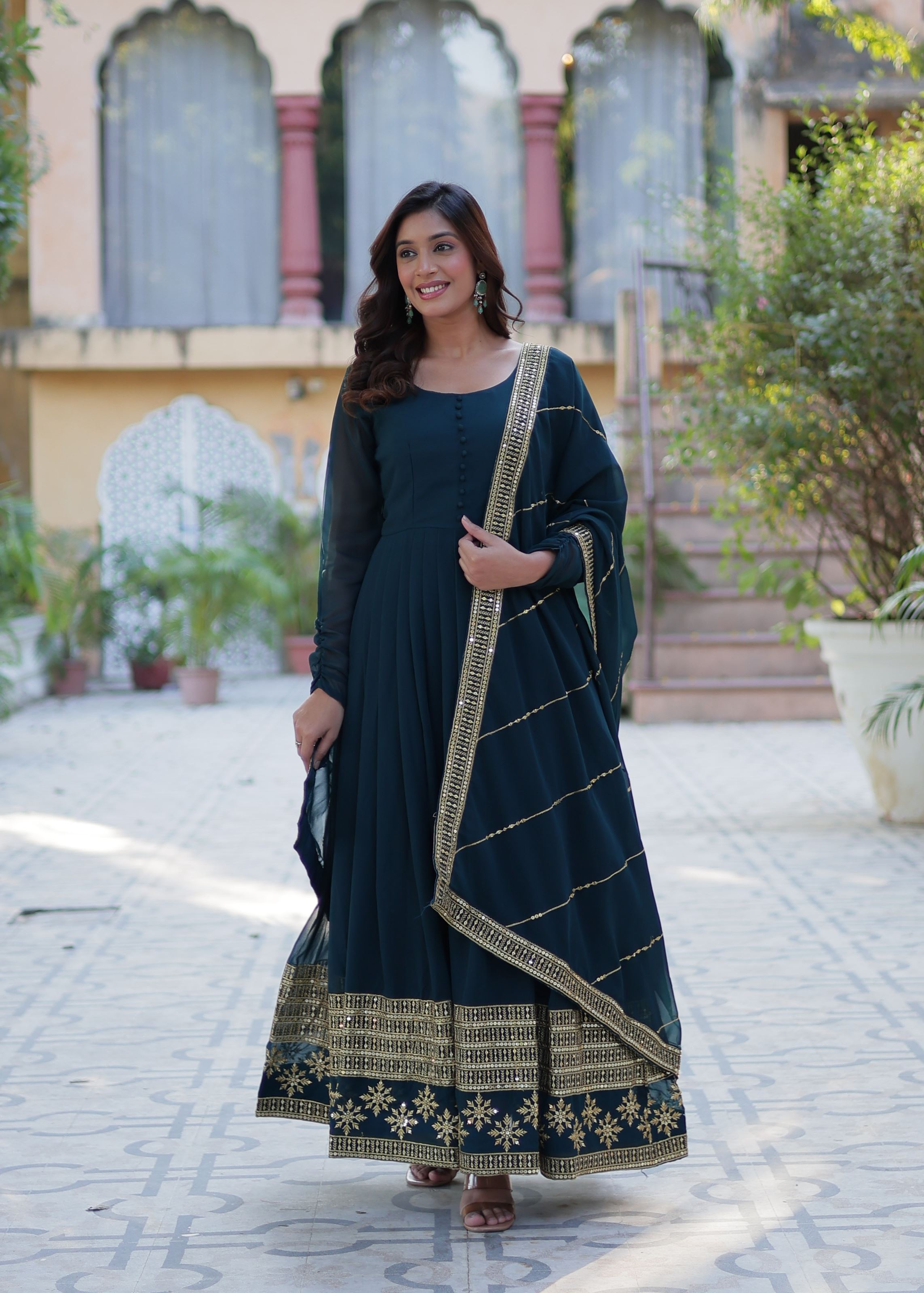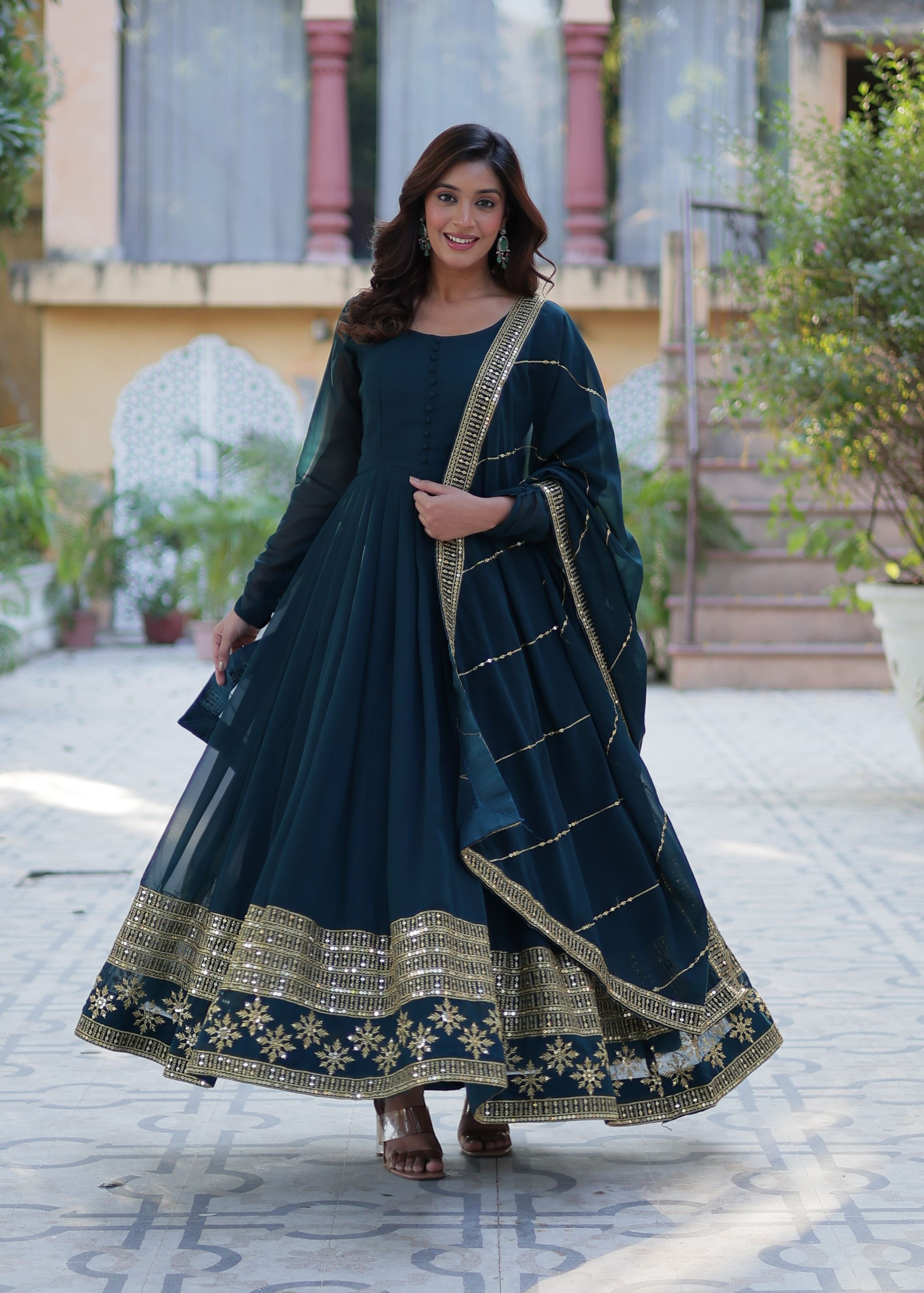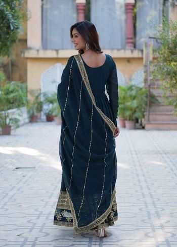 Add a refreshing pop of color to your ethnic wardrobe with the Green Faux Blooming Suit With Multi-Sequins Embroidered Work, exclusively from Aethnofit Fashions. Made from premium faux georgette, this outfit combines a soft, flowy texture with long-lasting durability. The stunning rama green shade brings a unique vibrance, while the intricate multi-sequins embroidered work adds elegant sparkle, making it a must-have for festive and formal occasions.