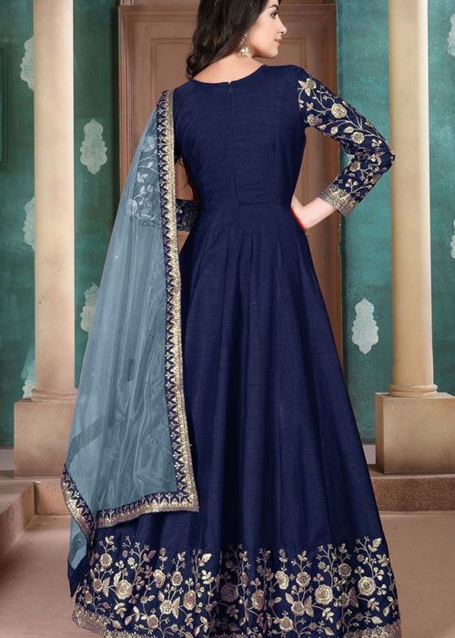 Navy Blue Adda Silk Heavy Embroidery with Embroidered bordered Border Dupatta Anarkali Suits