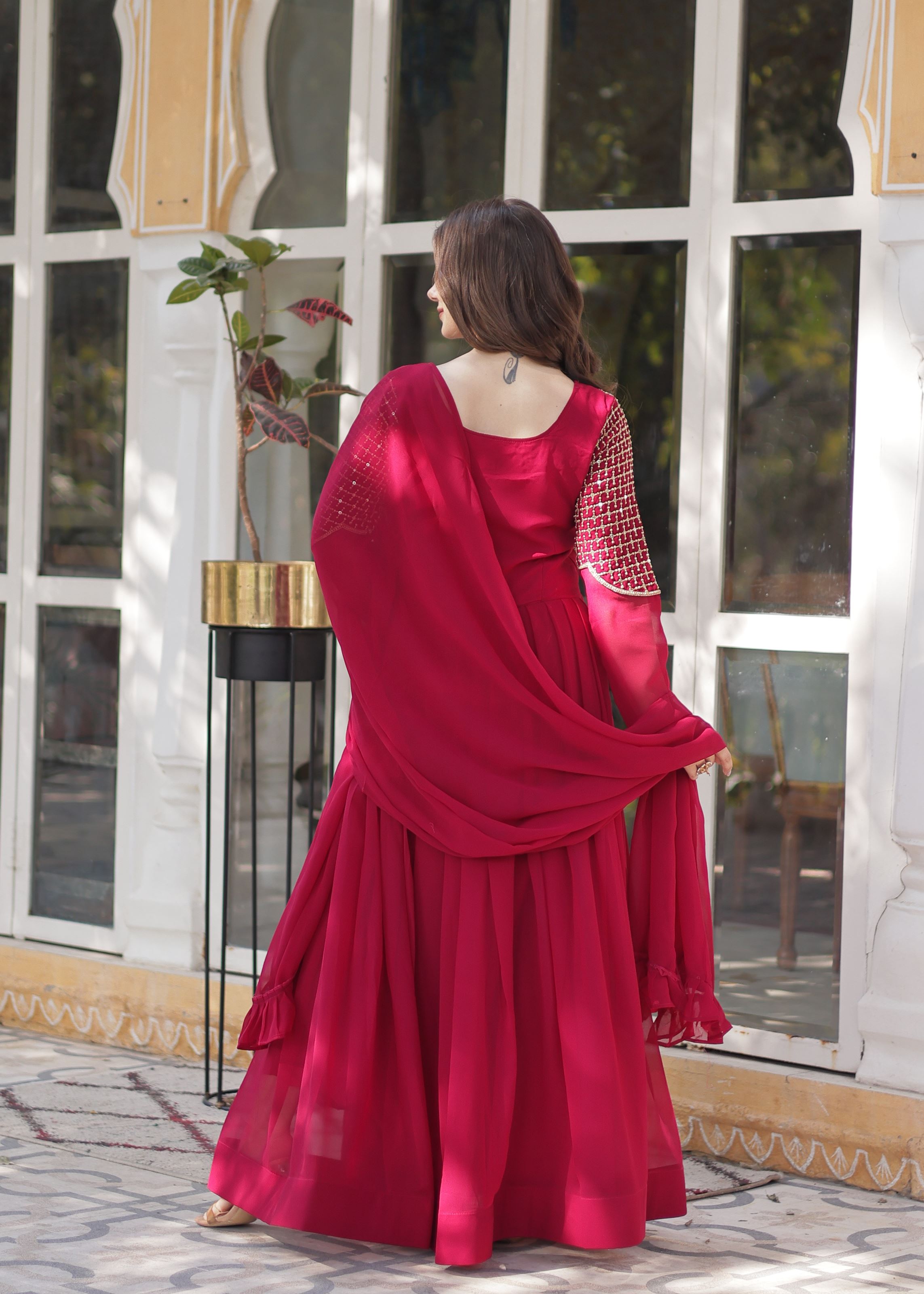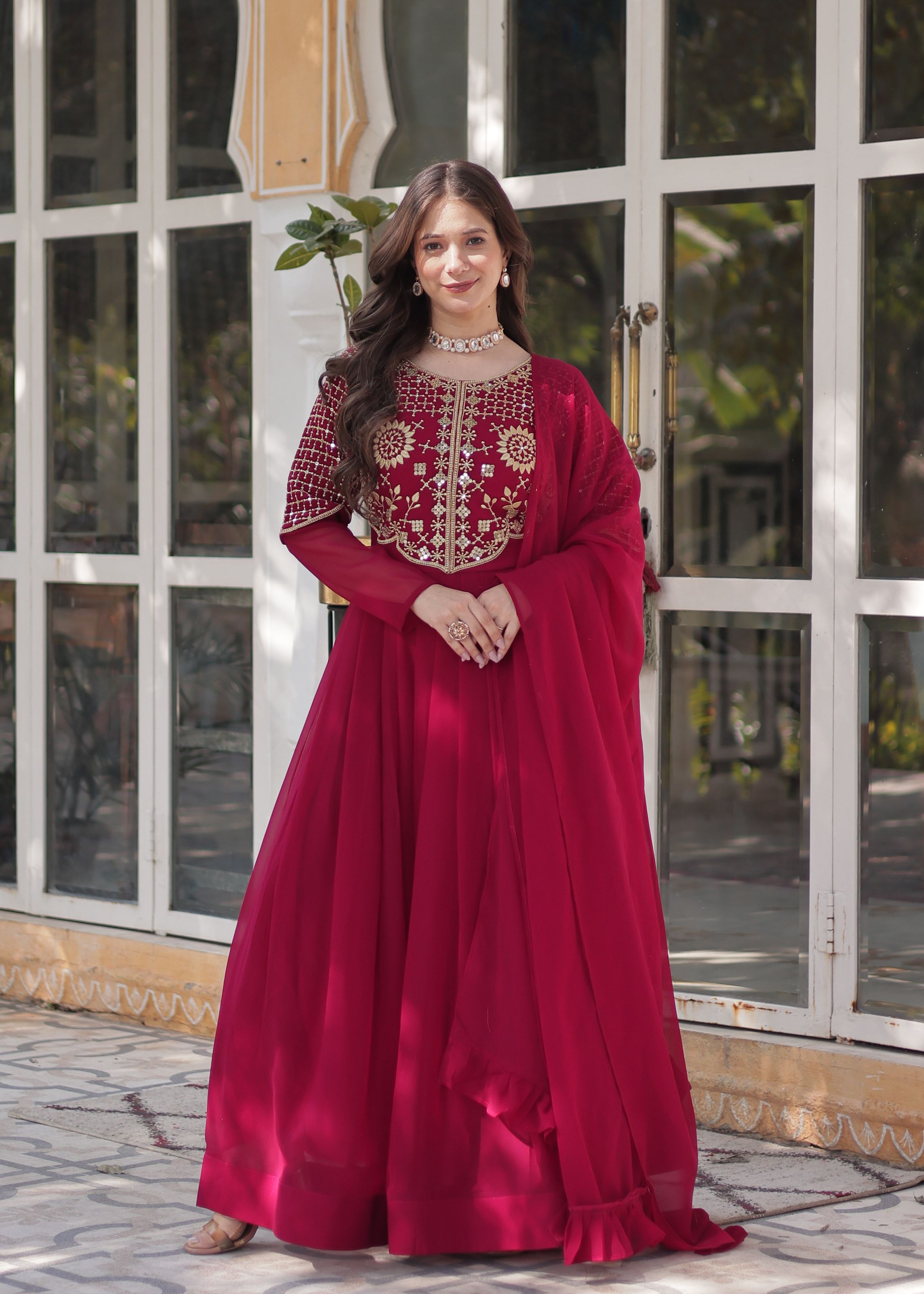 The soothing pink hue adds a touch of femininity and grace, while the detailed embroidery enhances the garment with texture and sophistication. Intricate patterns, thoughtfully embroidered on the bodice and flare, bring out the richness of traditional Indian craftsmanship. The matching Faux Blooming dupatta complements the look with a subtle elegance, making the ensemble feel both complete and effortlessly refined.