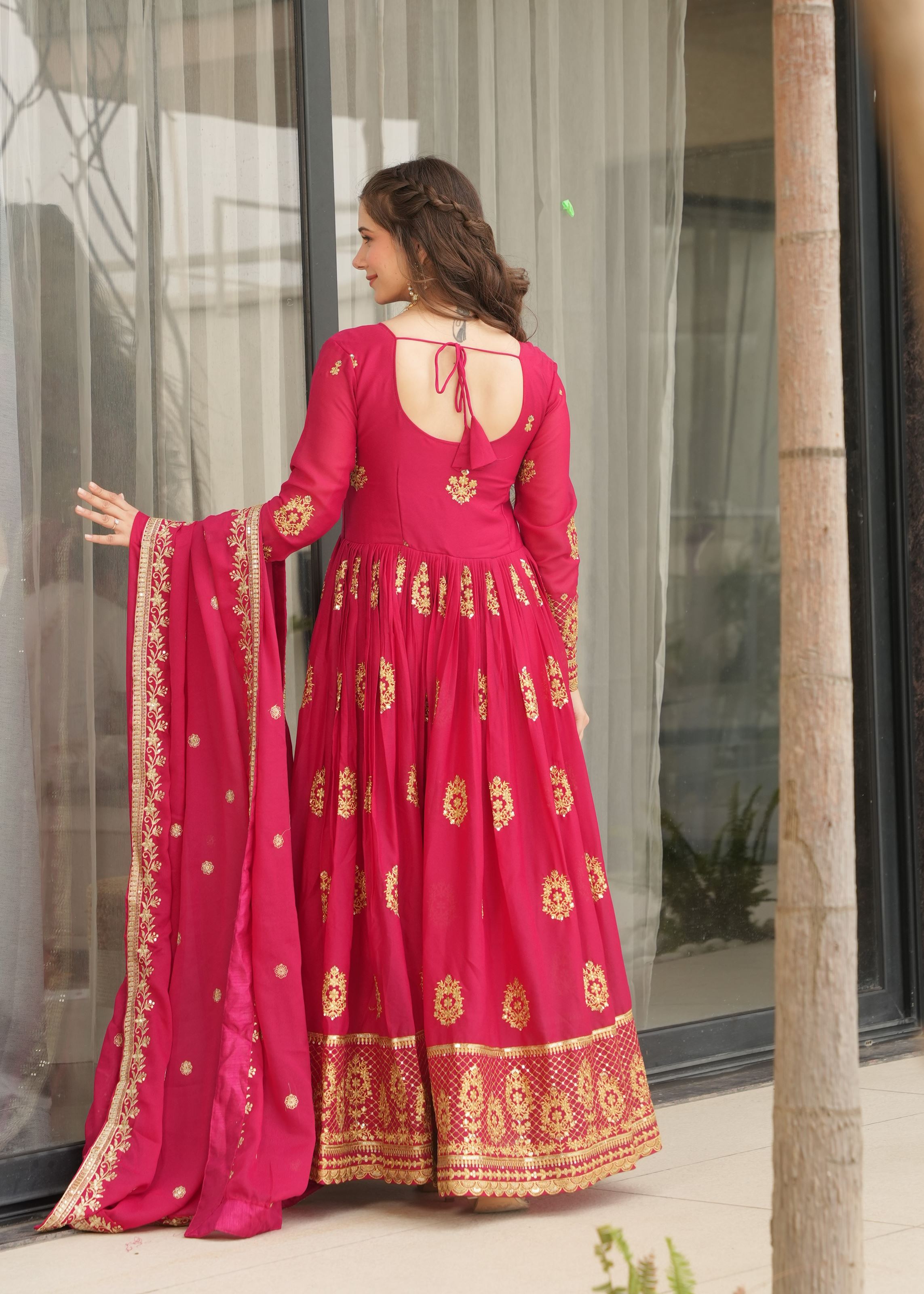 Step into effortless grace with this beautifully designed Pink Anarkali featuring Heavy Embroidery with Zari and Sequins Work, brought to you by Aethnofit Fashions. Crafted from luxurious Star Georgette fabric, this 56-inch floor-length Anarkali flows elegantly while offering lightweight comfort — ideal for festive occasions, wedding functions, or evening celebrations.
