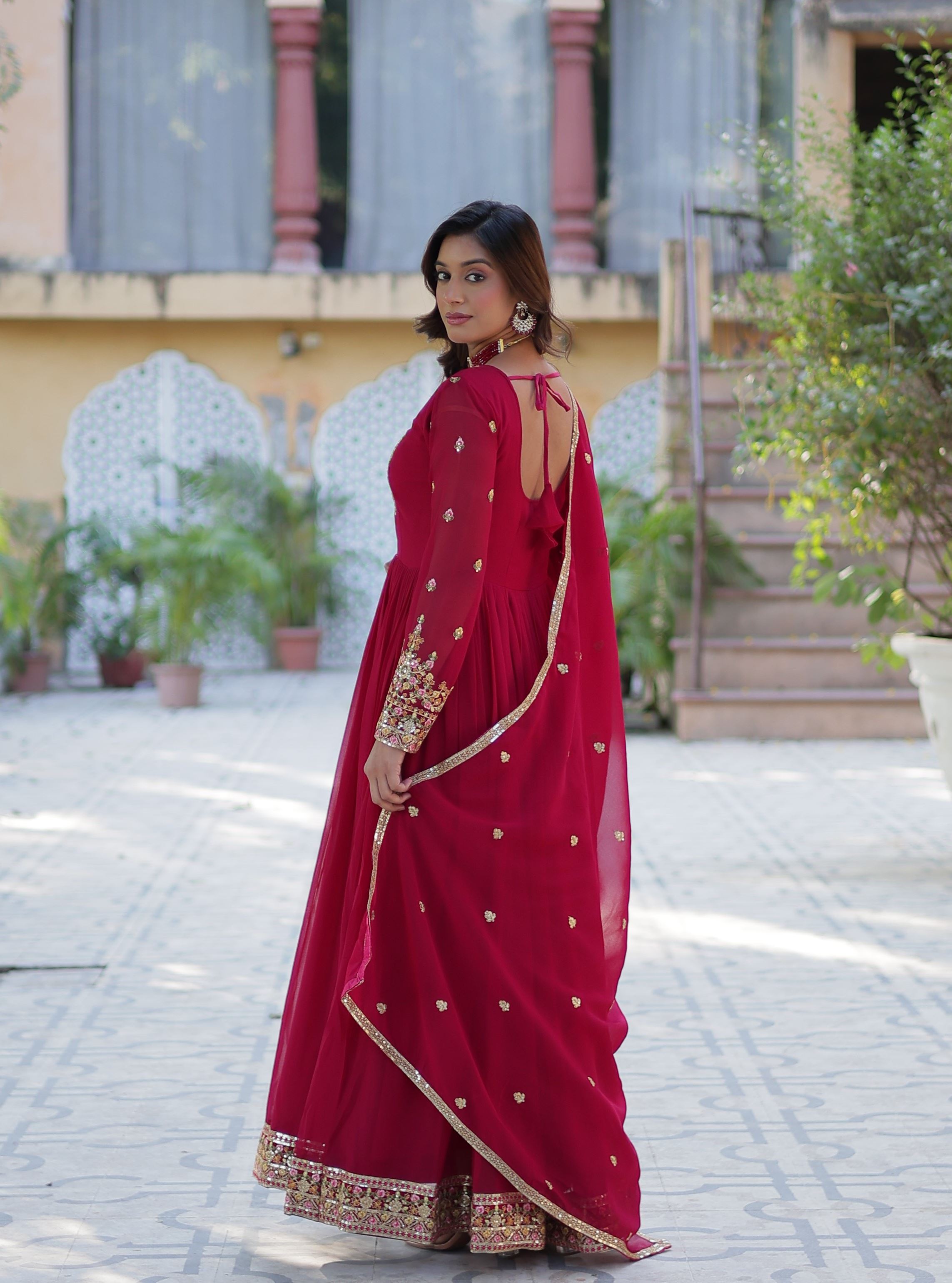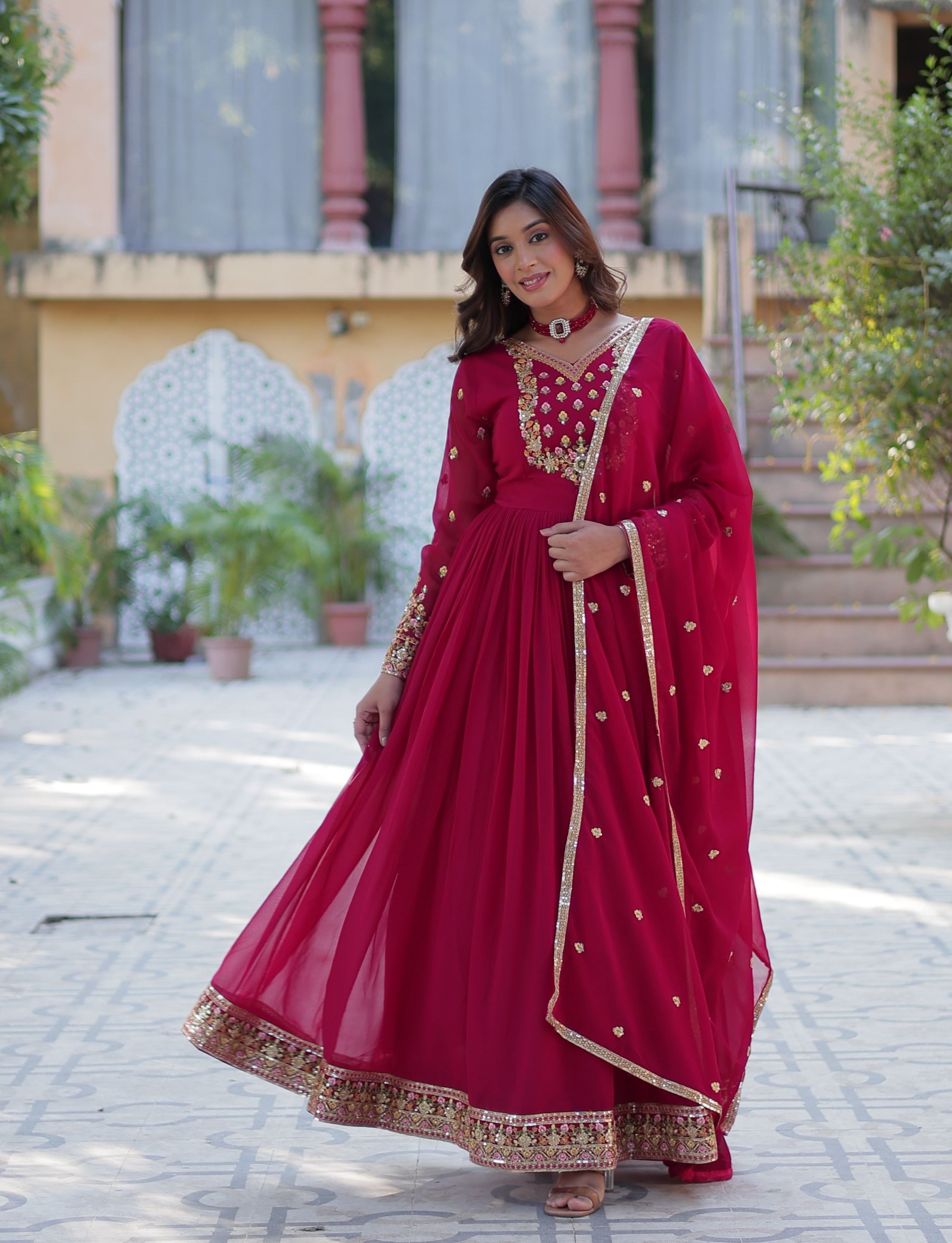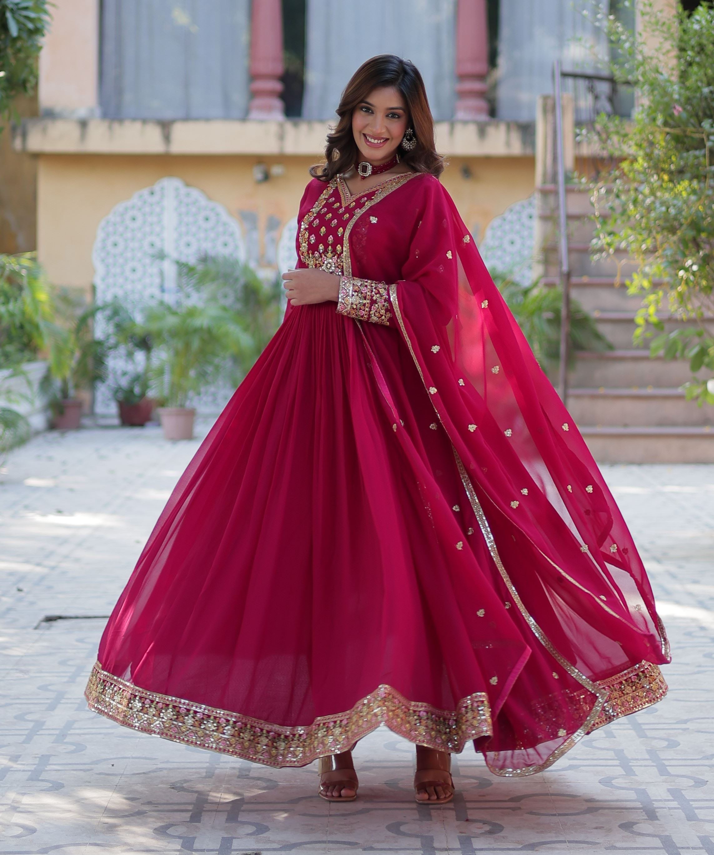 Add a sparkle of celebration to your ethnic collection with this elegant Pink Anarkali featuring Heavy Sequins Embroidered Work, thoughtfully designed by Aethnofit Fashions. Crafted from rich Faux Blooming Georgette, this 56-inch floor-length Anarkali offers a graceful flow and lightweight comfort, perfect for weddings, festive gatherings, or formal evenings.