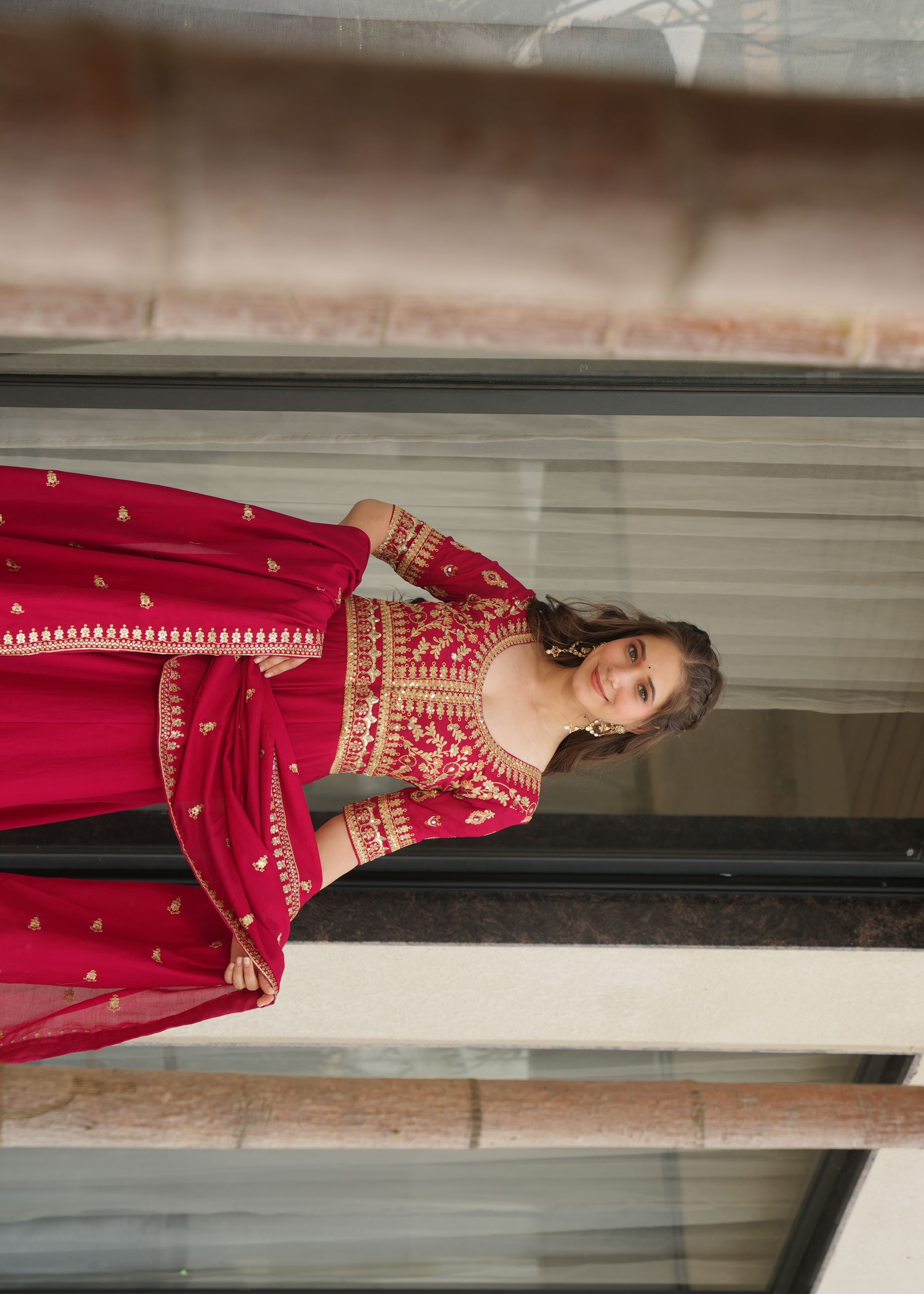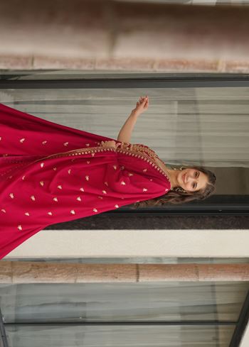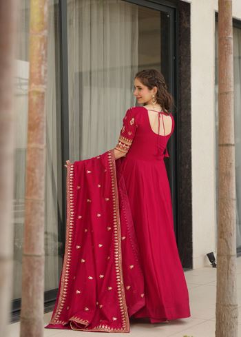 The soft pink shade radiates femininity and sophistication, while the intricate zari embroidery and vibrant sequins bring a glamorous sparkle. The embroidery work, thoughtfully spread across the bodice and flare, adds depth and richness to the design, ensuring you make a graceful statement wherever you go. The coordinating Vichitra silk dupatta adds a fluid, polished finish to this ensemble.