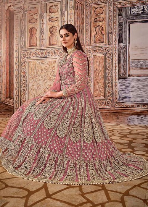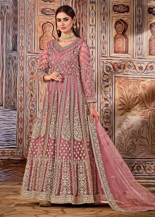 Pink Net Heavy Thread Embroidery And Zari Work Anarkali Suits