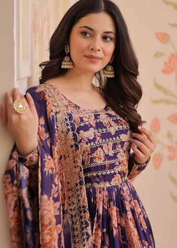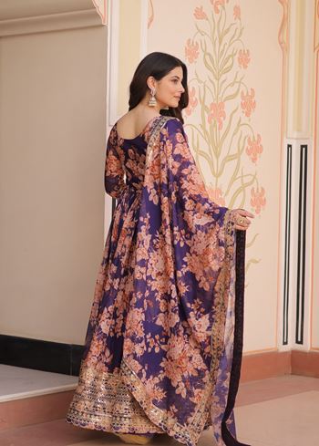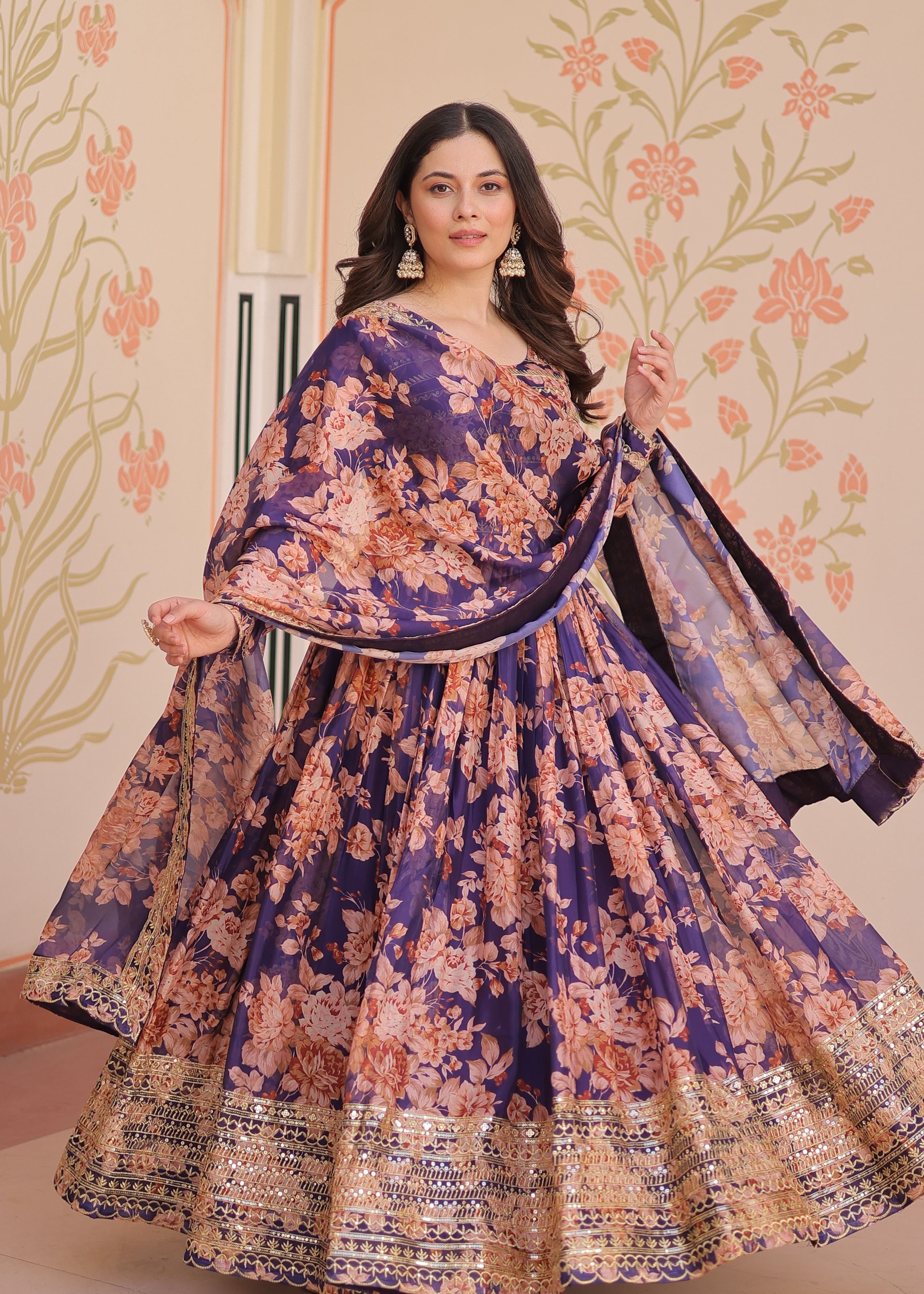 Embrace luxurious elegance with this Purple Anarkali featuring Heavy Digital Print and Embroidered Sequins Work, exclusively from Aethnofit Fashions. Crafted from premium Russian silk, this 56-inch floor-length Anarkali is designed to offer rich texture, smooth drape, and a regal finish that elevates your ethnic wardrobe.