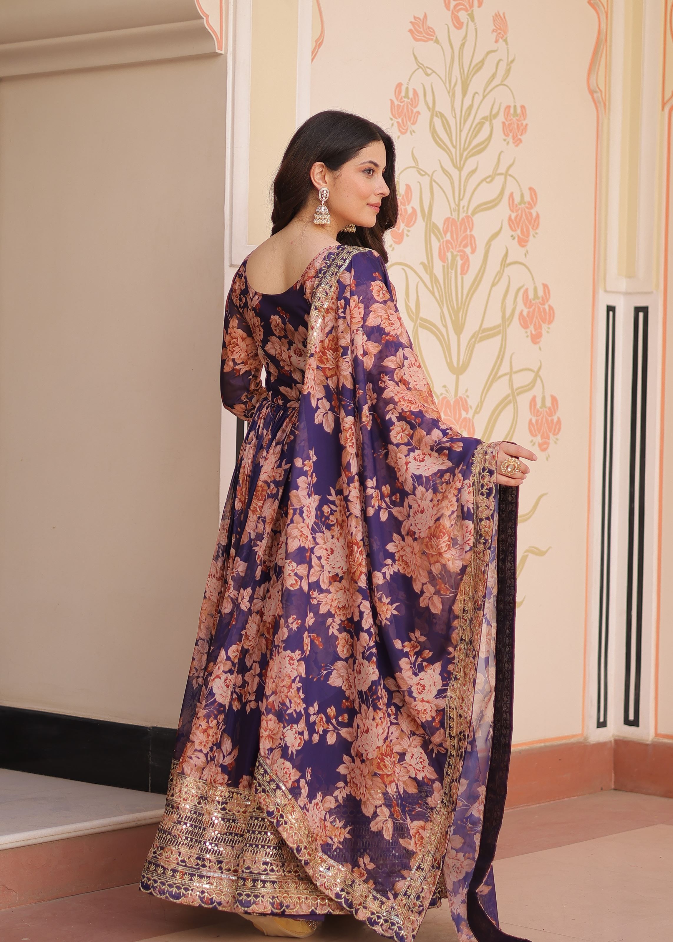 Purple Anarkali With Heavy Digital Print With Embroidered Sequins Work