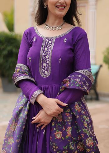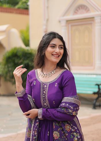 Elevate your ethnic wardrobe with the regal charm of the Purple Chinon Suit With Sequins Embroidered Work, a luxurious stitched Anarkali suit from Aethnofit Fashions. Made from high-quality Chinon fabric, this suit offers a rich texture, fluid drape, and lightweight comfort — ideal for festive occasions, cultural events, or polished office wear salwar suits. The royal purple hue is eye-catching and elegant, while the fine sequins embroidery adds a subtle yet stunning sparkle that enhances its graceful silhouette.