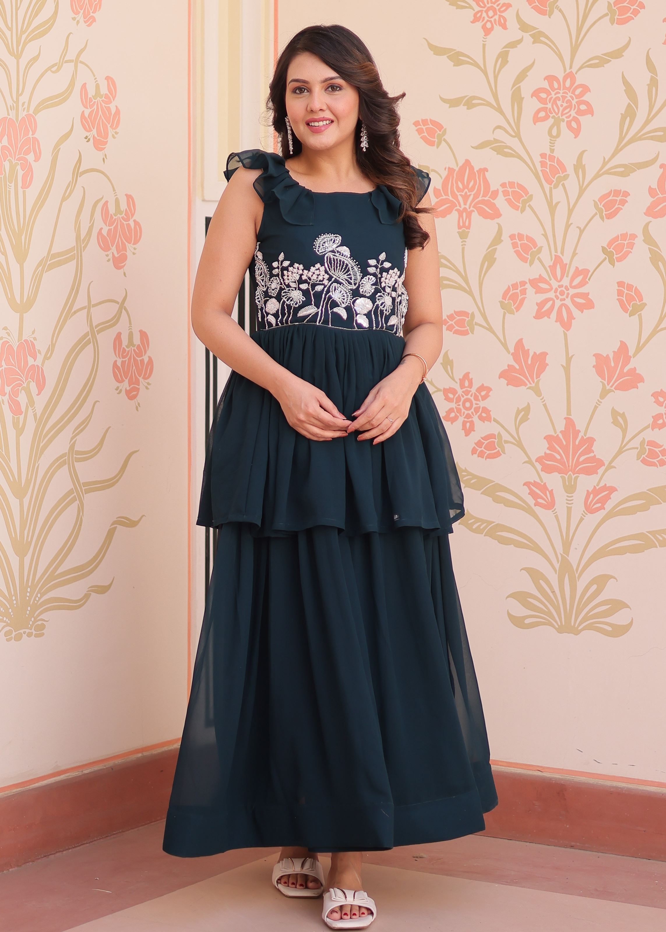 Showcase your elegance with this graceful Rama Anarkali featuring Heavy Beads Embroidered Work, exclusively from Aethnofit Fashions. Crafted from premium Faux Blooming fabric, this 56-inch floor-length Anarkali blends comfort and sophistication, making it a perfect choice for festive gatherings, cultural occasions, or formal day events.