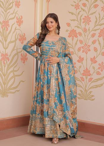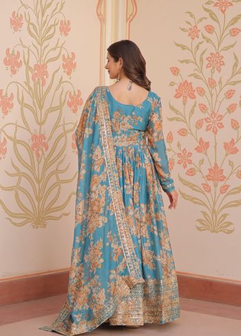 Rama Anarkali With Heavy Digital Print With Embroidered Sequins Work