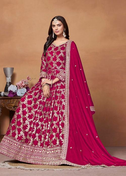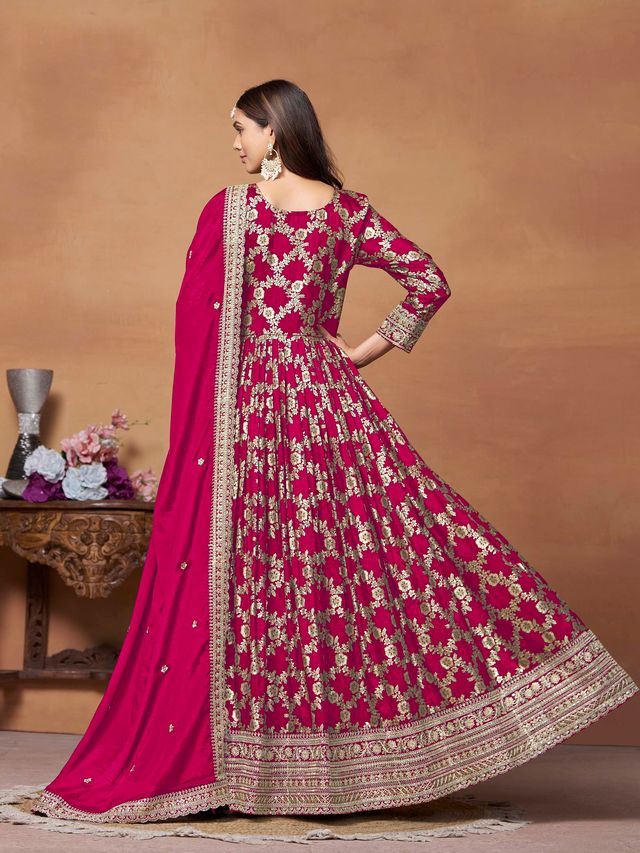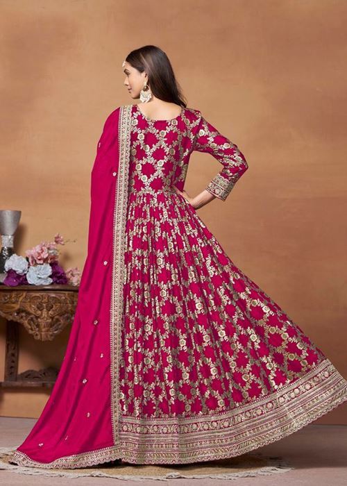 Rani Pink Anarkali Suit With Jacquard Woven With Thread Embroidery Work