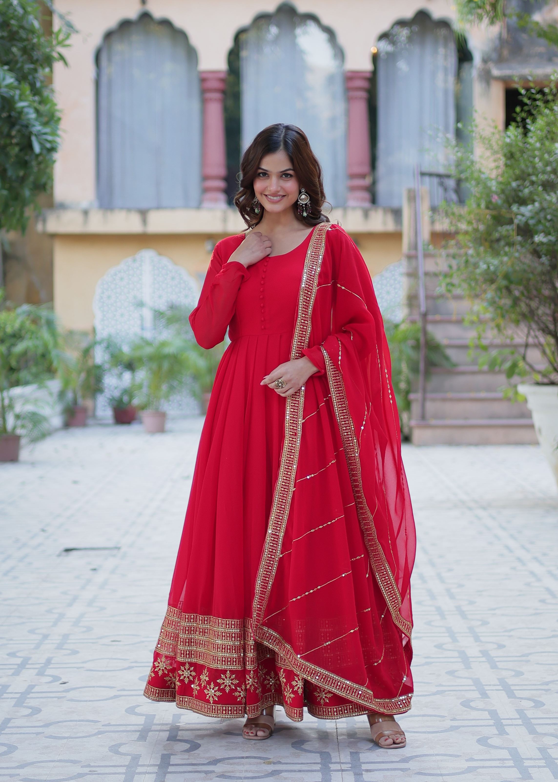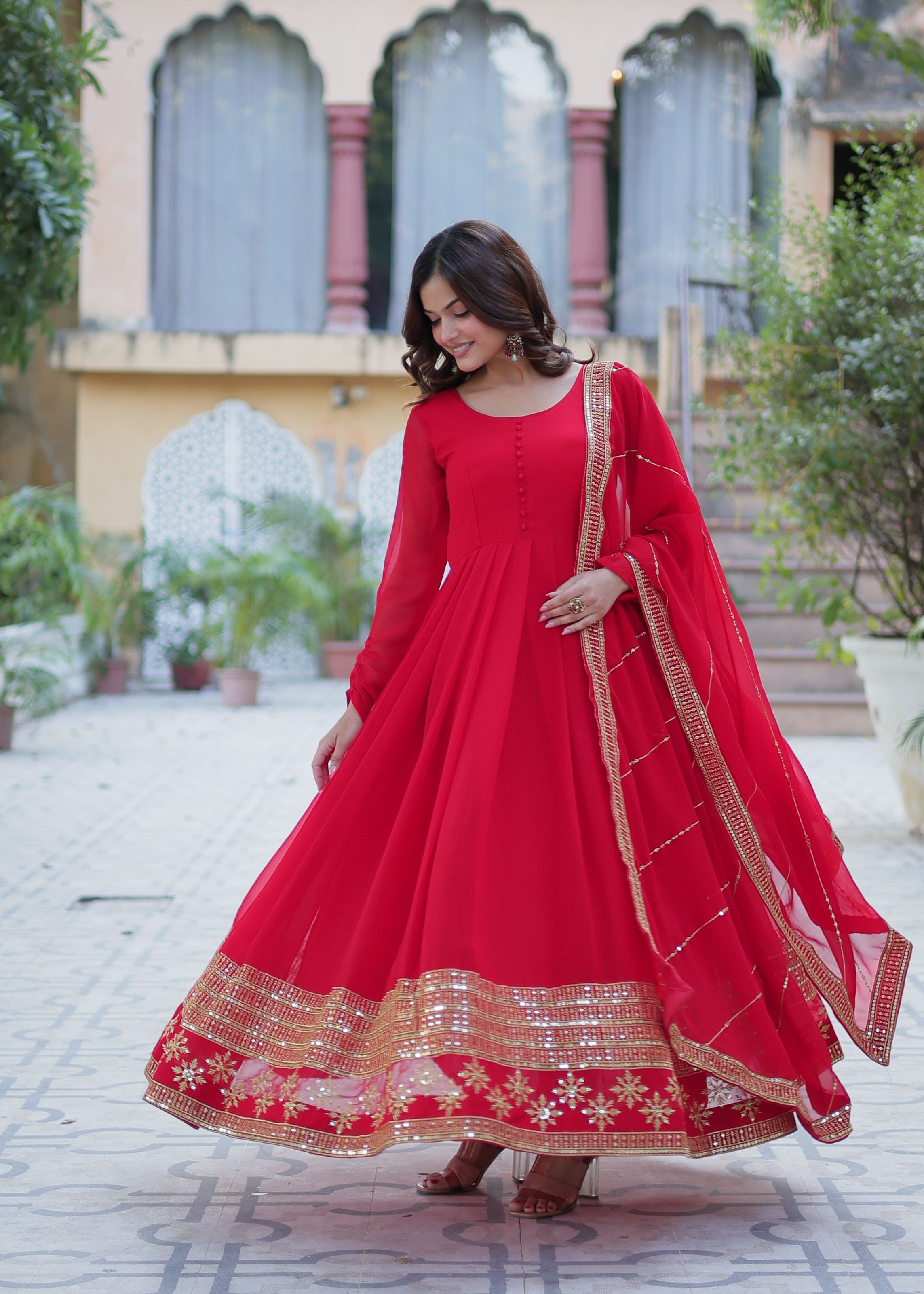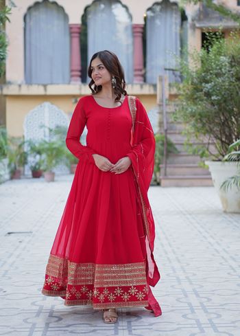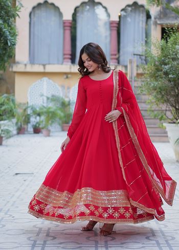 Make a bold ethnic statement with the Red Faux Blooming Suit With Multi-Sequins Embroidered Work, an exclusive design from Aethnofit Fashions. Crafted from high-quality faux georgette, this suit combines elegance with all-day comfort. The rich red tone radiates vibrancy and is complemented by intricate multi-sequins embroidery, carefully hand-applied by skilled Indian artisans for a luxurious and festive finish.