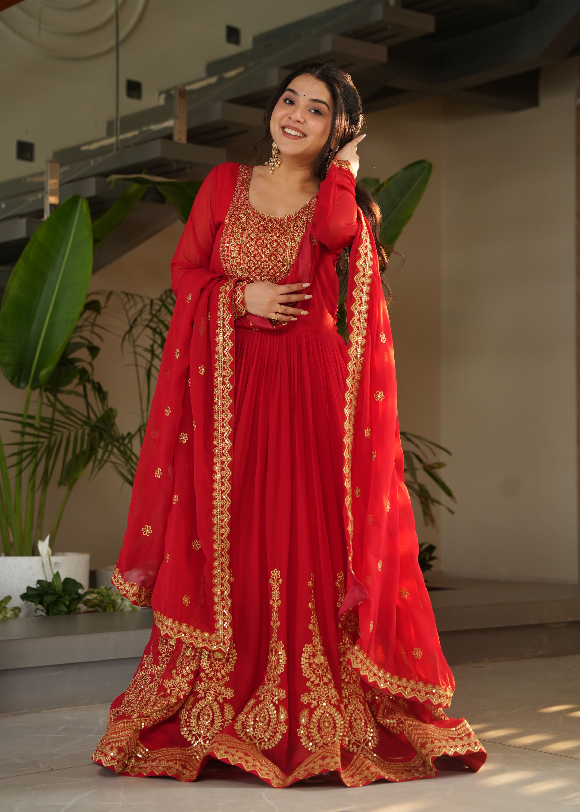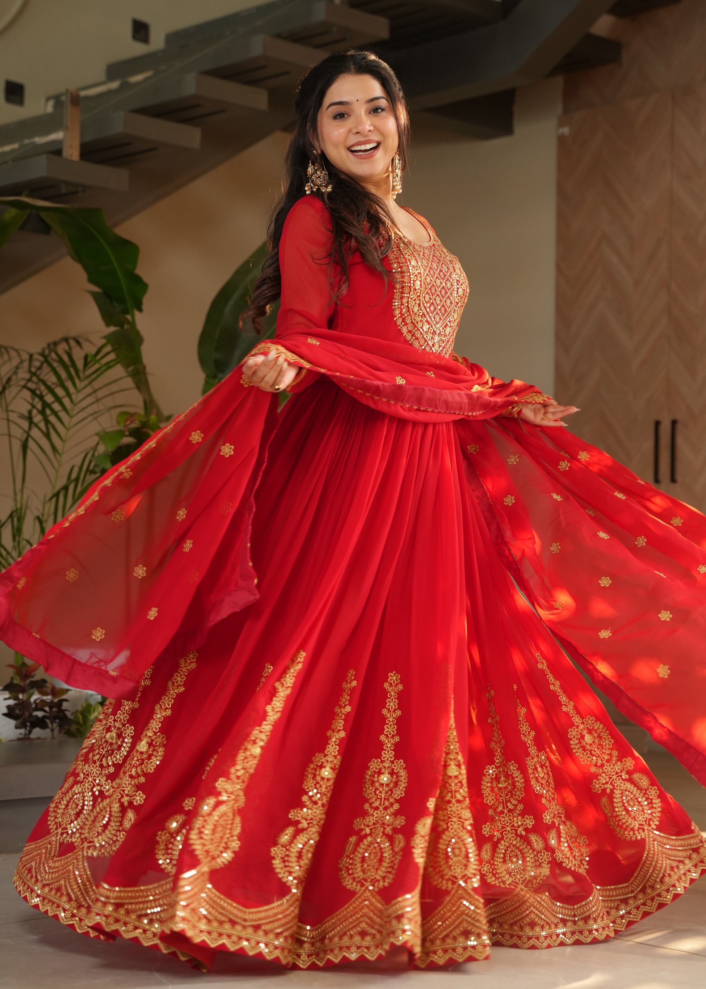 Make a powerful style statement with this stunning Red Anarkali featuring Heavy Embroidery with Zari and Sequins Work, exclusively designed by Aethnofit Fashions. Crafted from premium Faux Blooming fabric, this 56-inch floor-length Anarkali delivers a rich, voluminous drape — perfect for festive celebrations, sangeet nights, or traditional functions.