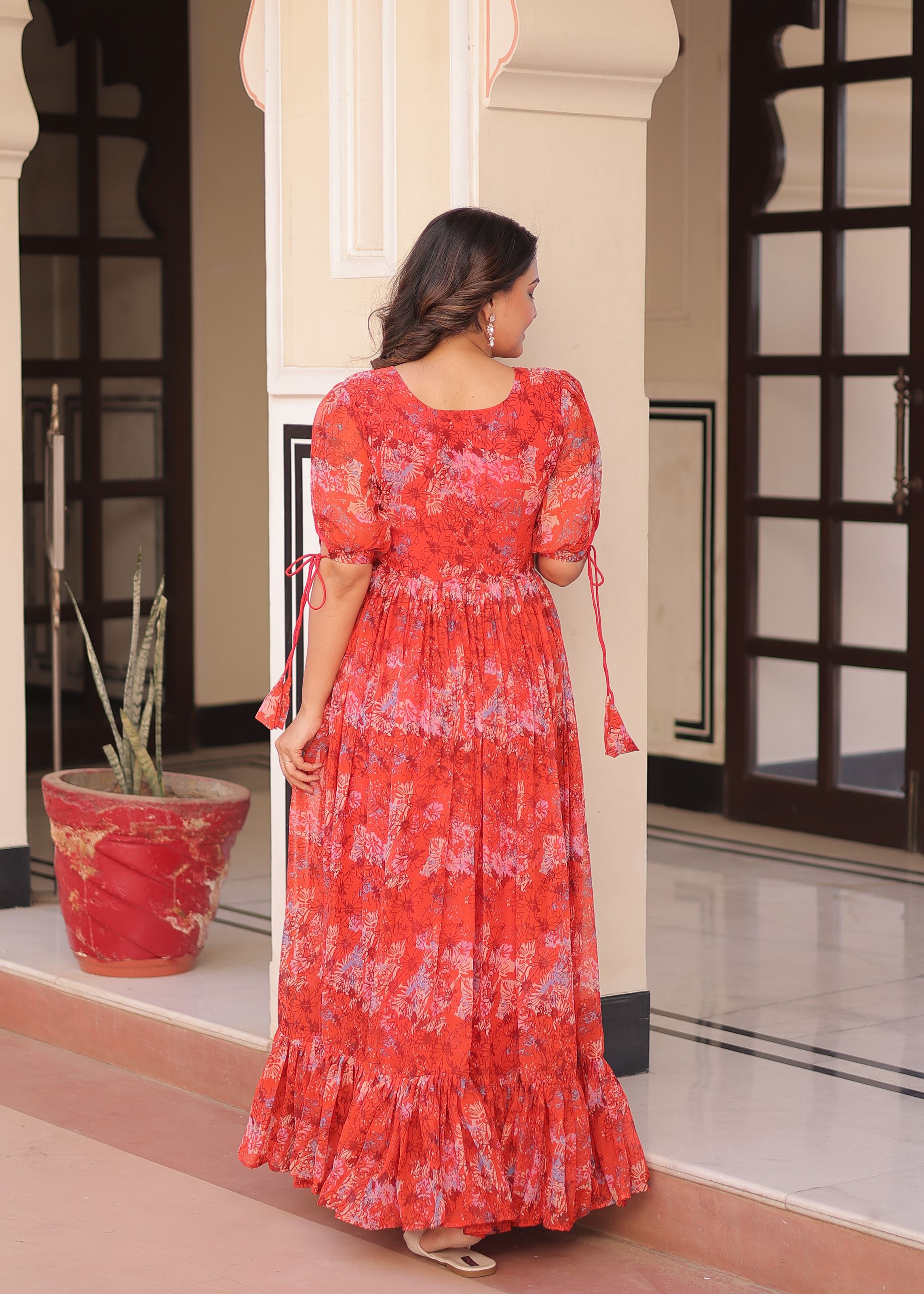 Step into the spotlight with this vibrant Red Anarkali with Heavy Printed Work, designed to captivate with its graceful flair and striking aesthetic. Brought to you by Aethnofit Fashions, this 56-inch floor-length Anarkali is crafted from premium faux georgette, offering a lightweight and flowy drape that’s perfect for long hours of wear — whether at cultural events, office gatherings, or festive celebrations.