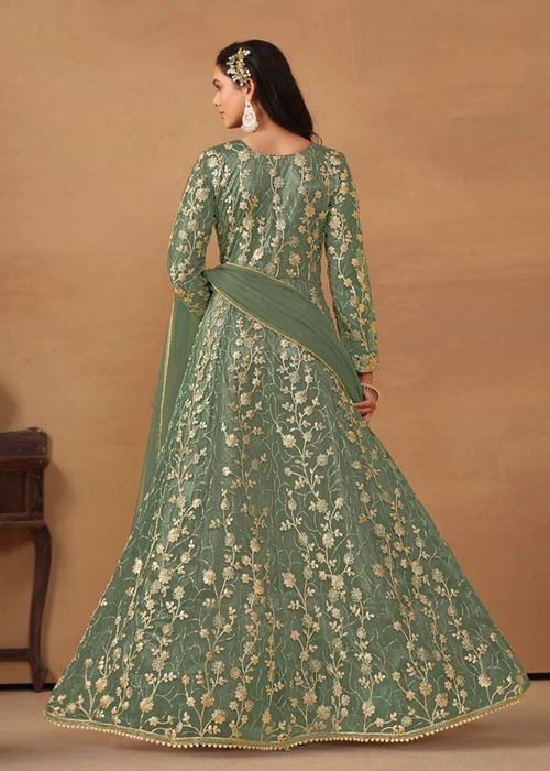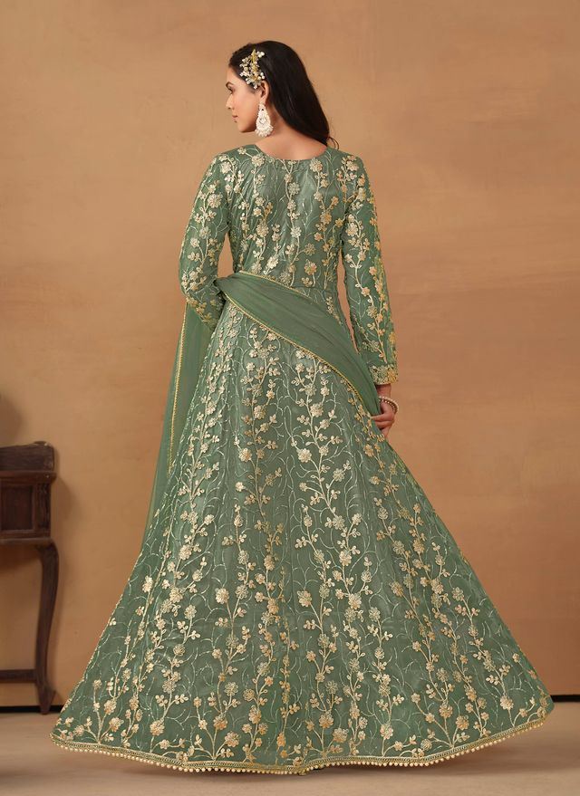 Sage Green Anarkali Suit With Heavy Thread Embroidery With Sequis Work