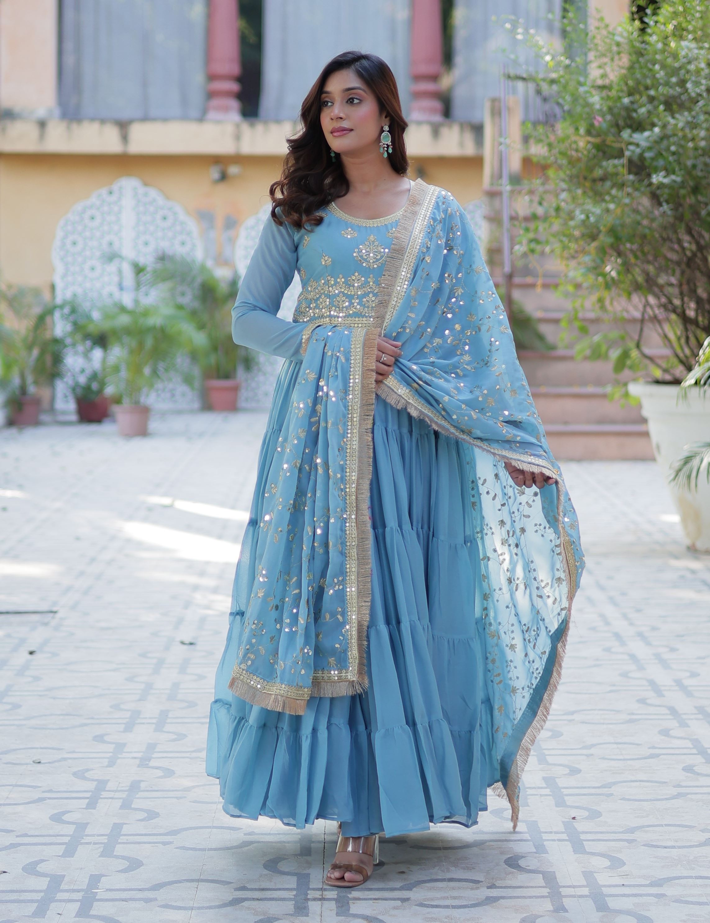 Step into serene elegance with this charming Sky Anarkali featuring Heavy Embroidered Work, exclusively from Aethnofit Fashions. Crafted from premium Star Georgette fabric, this 56-inch floor-length Anarkali flows gracefully, offering a lightweight and breathable feel that’s perfect for festive celebrations, cultural events, or refined day occasions.