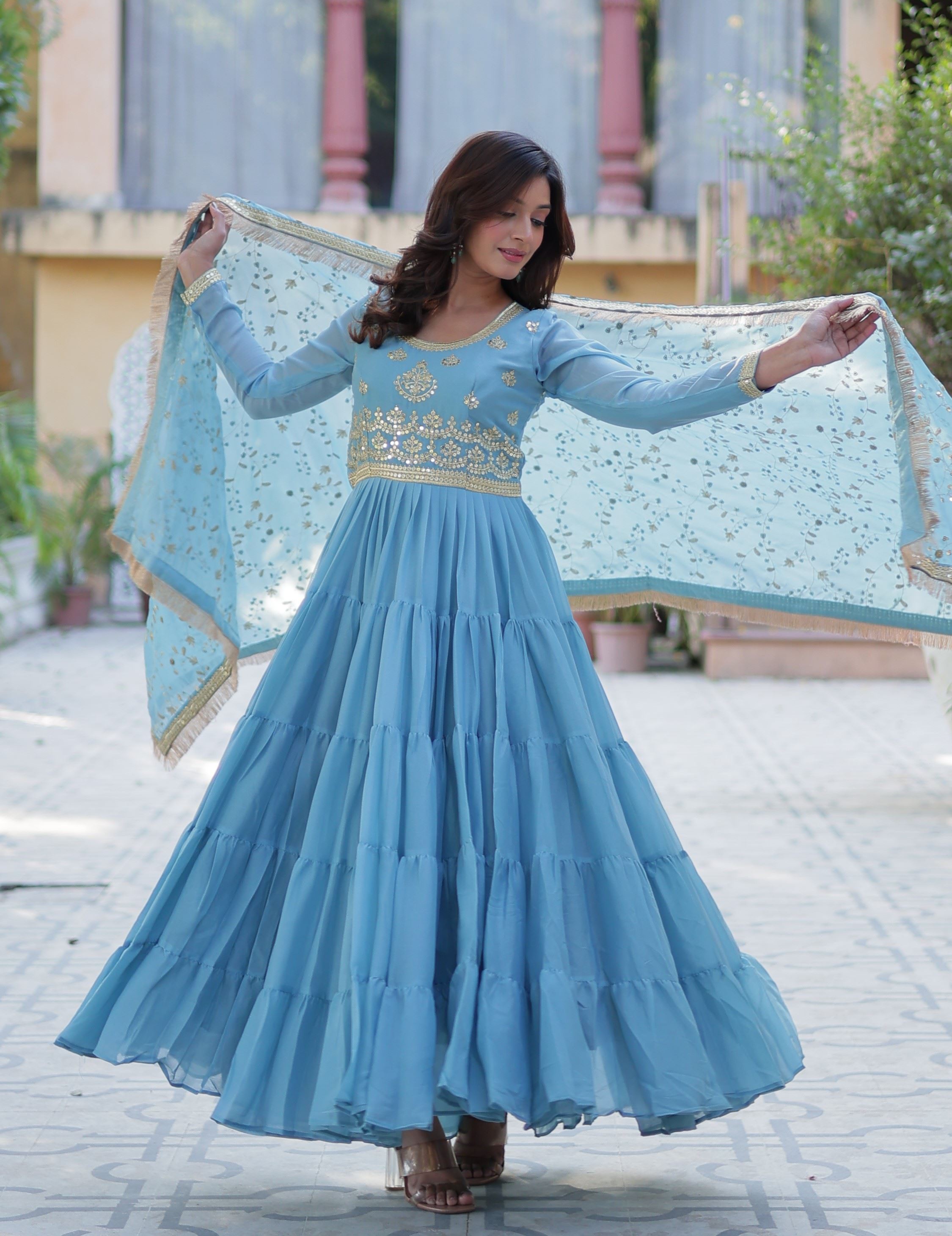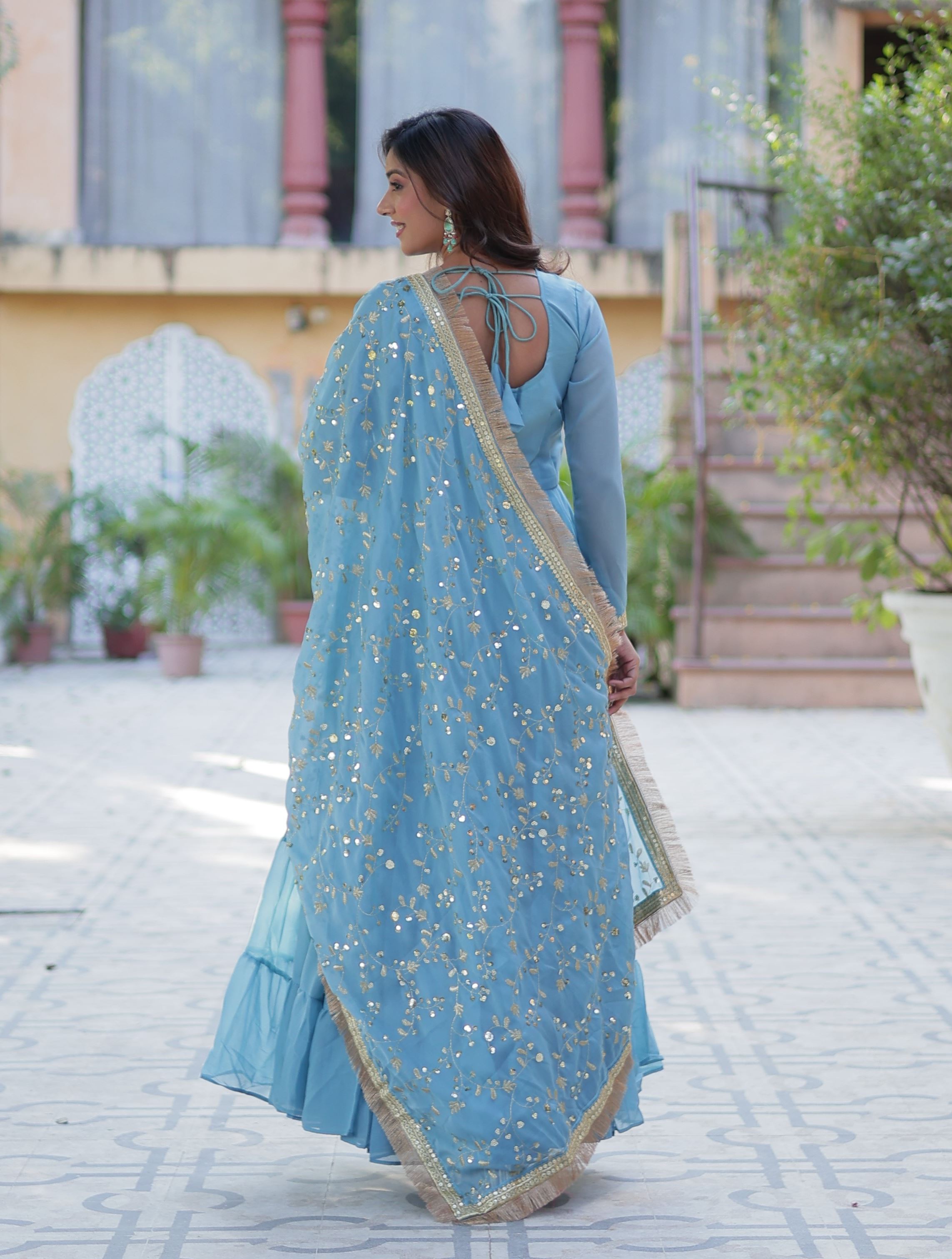 The soothing sky blue hue brings a refreshing and youthful vibe, while the intricate embroidery across the bodice and flare adds a layer of sophistication. Designed to highlight traditional artistry, the embroidery is delicately balanced to offer visual richness without being overpowering. The matching Star Georgette dupatta enhances the look with an elegant drape and coordinated finish.