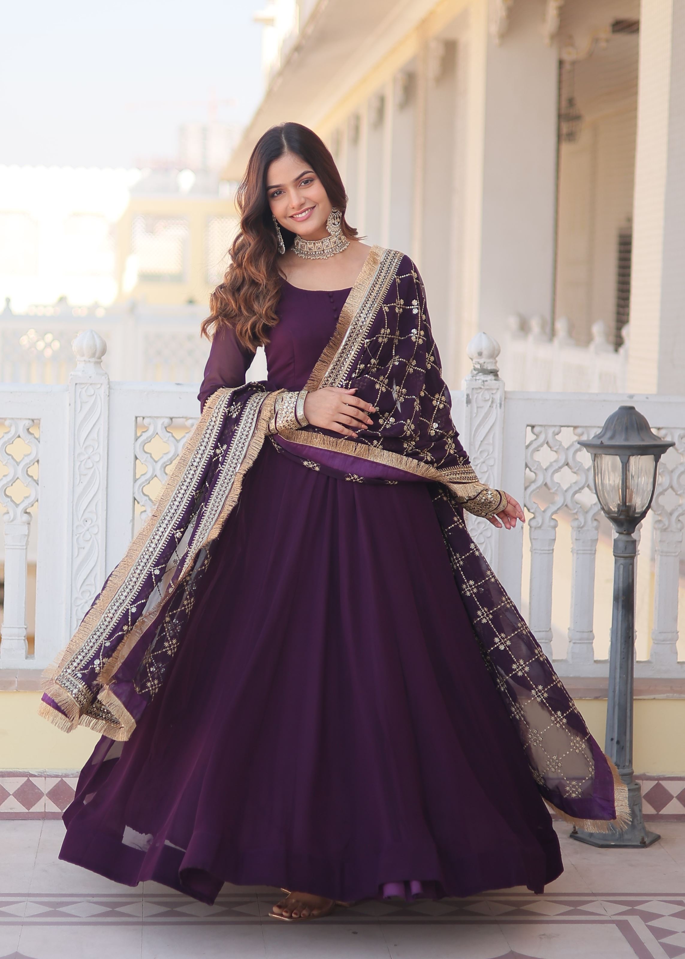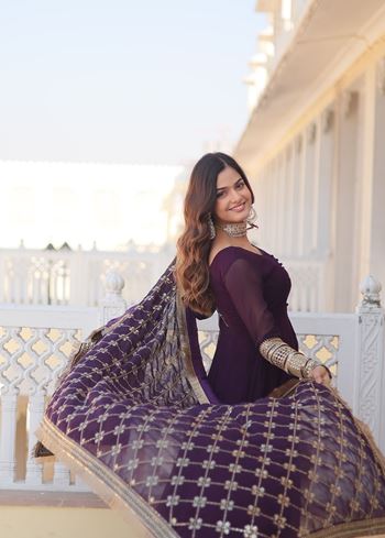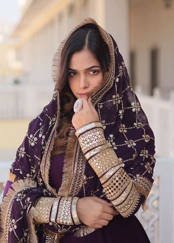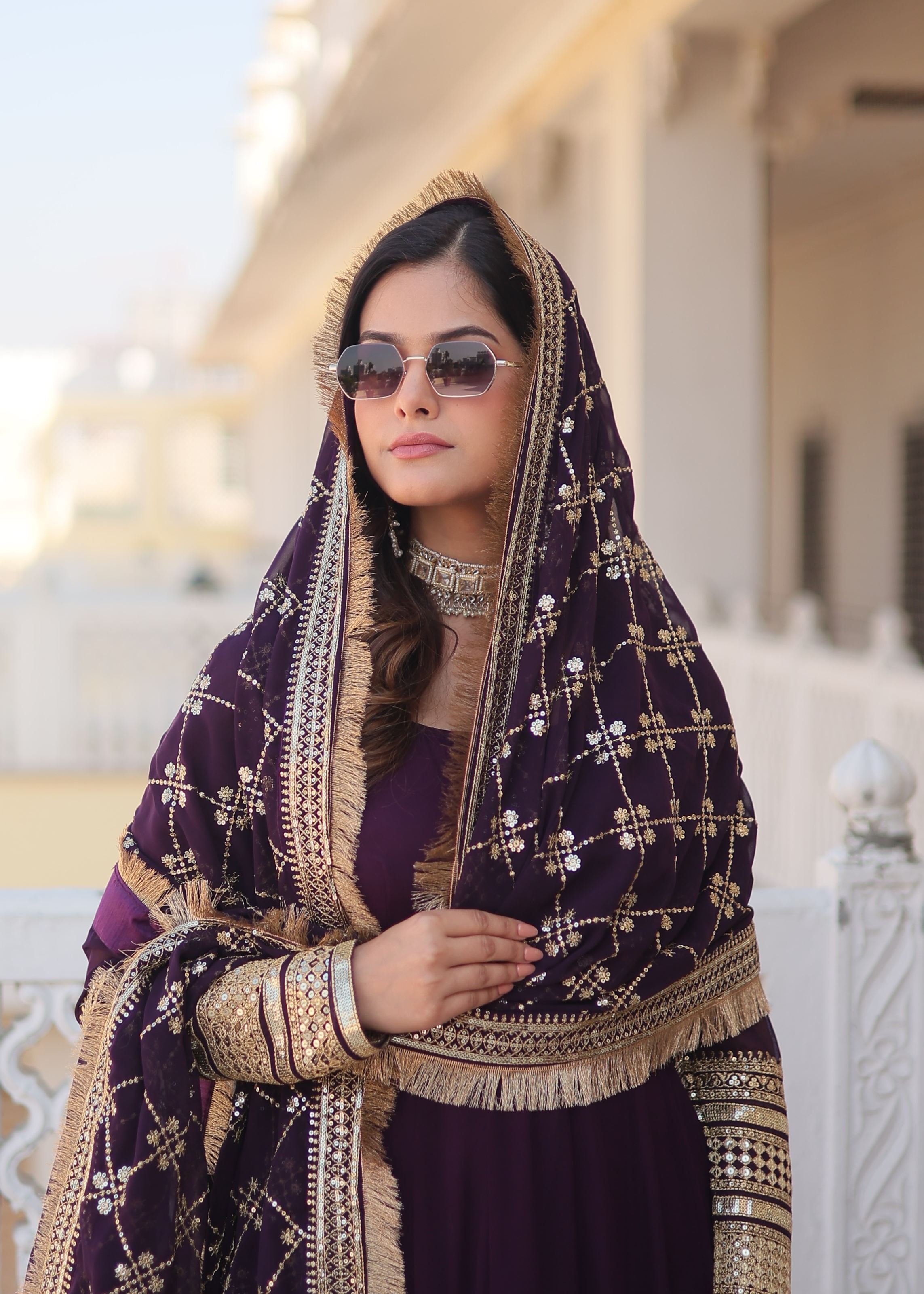 Add a touch of glamour to your ethnic wardrobe with the Wine Faux Blooming Suit With Embroidered Multi-Sequins Work, exclusively from Aethnofit Fashions. Made from elegant faux blooming georgette, this suit offers a soft, flowing silhouette that is lightweight and perfect for all-day wear. The rich wine hue radiates classic elegance, while the all-over multi-sequins embroidery creates a shimmering effect that’s ideal for festive events, weddings, or special occasions.