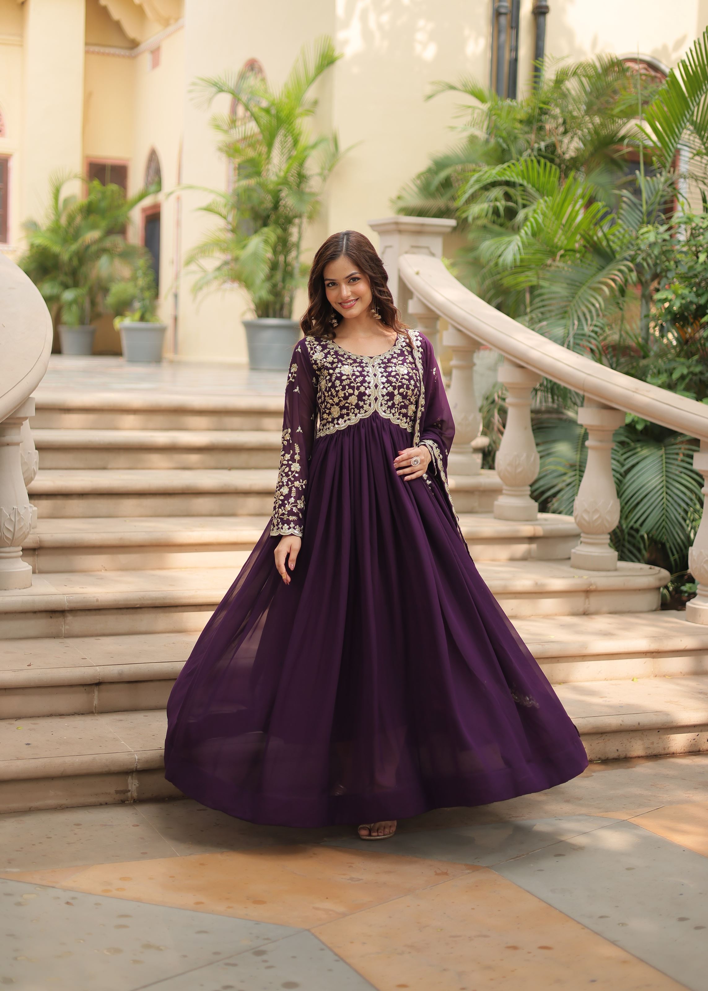This fully stitched, ready-to-wear suit is designed for convenience and style, eliminating the need for any additional tailoring. Proudly crafted in India, it includes a beautifully embroidered Anarkali kurta, matching bottom, and a dupatta that completes the look with coordinated sequin and zari accents.