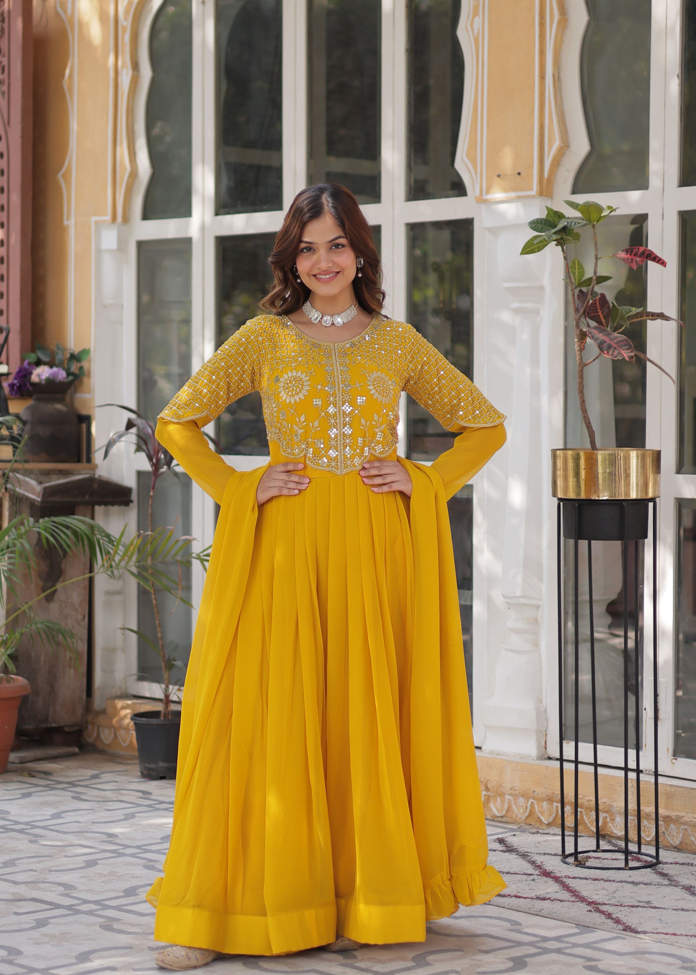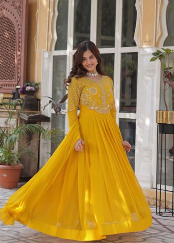 Brighten your ethnic wardrobe with this graceful Yellow Anarkali featuring Heavy Embroidery Work, thoughtfully crafted by Aethnofit Fashions. Made from premium Faux Blooming fabric, this 56-inch floor-length Anarkali is designed to offer a comfortable yet structured fit, perfect for festive occasions, cultural celebrations, or elegant day events.