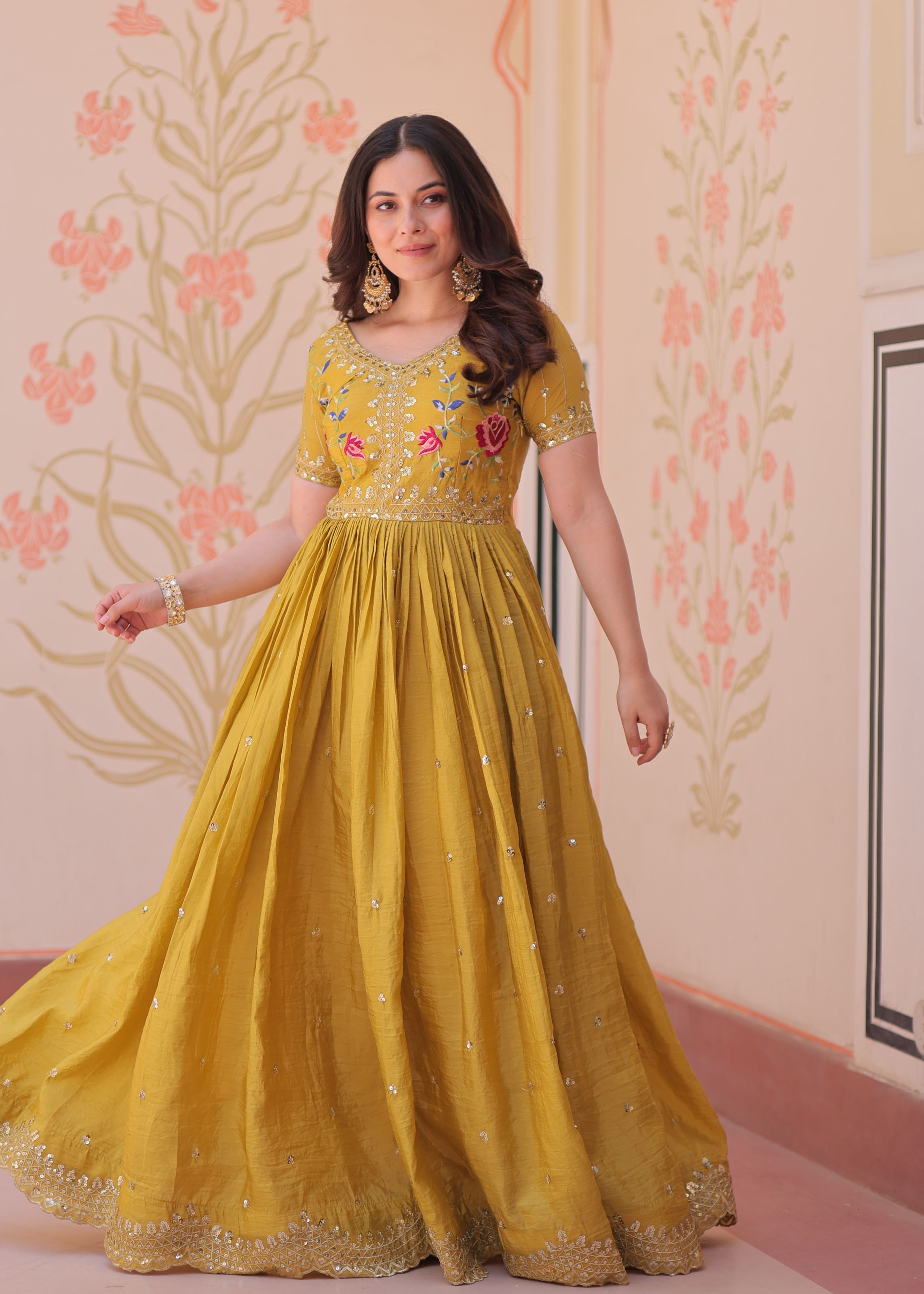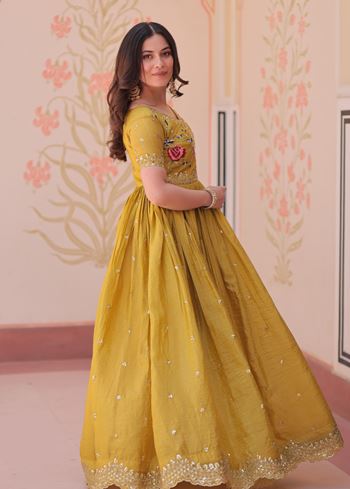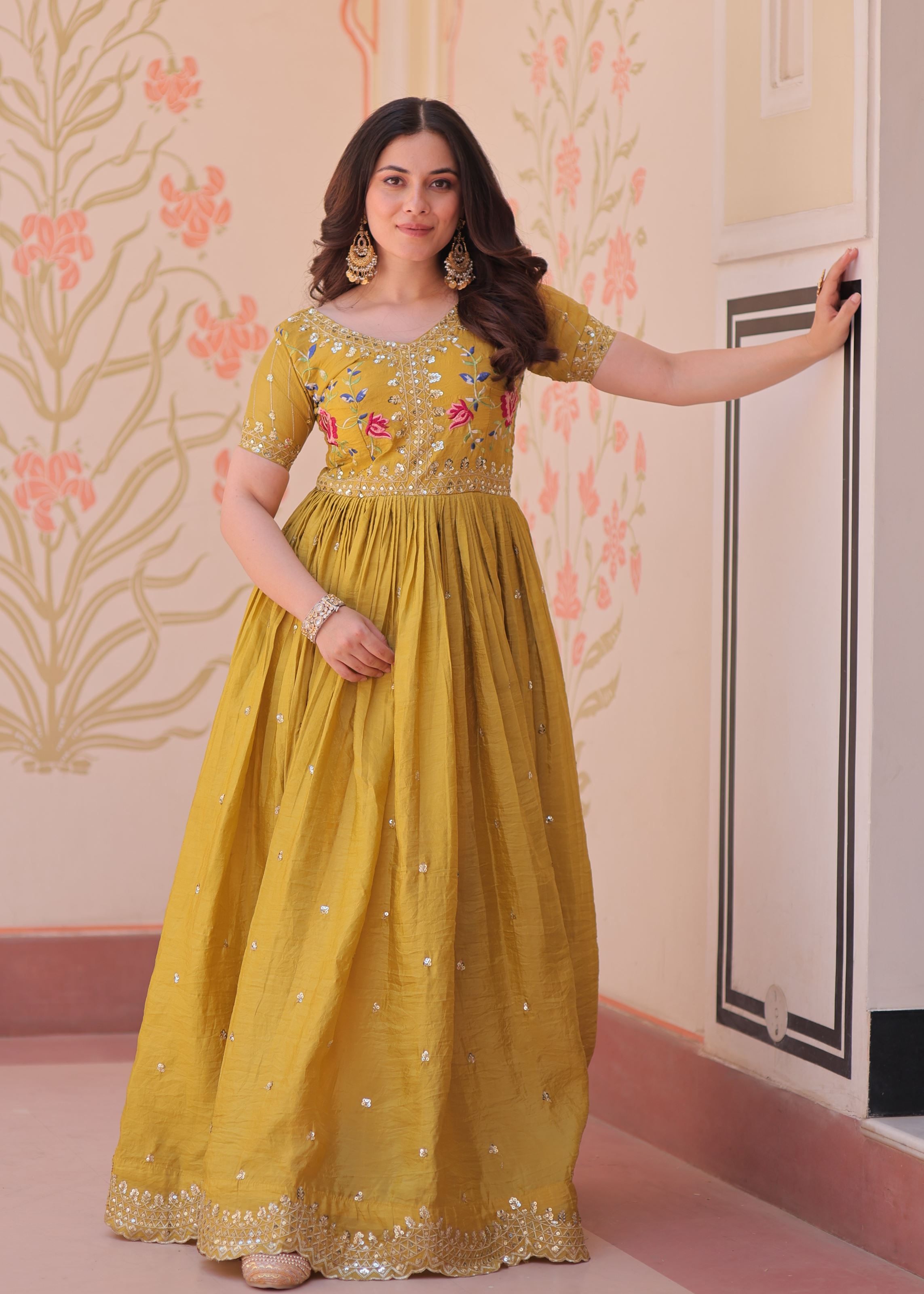 Infuse your festive wardrobe with brightness and tradition through this stunning Yellow Anarkali featuring Heavy Multi Thread Embroidery with Zari and Sequins Work, thoughtfully curated by Aethnofit Fashions. Crafted from premium Gold Crush fabric, this 55-inch floor-length Anarkali combines a radiant look with luxurious comfort — ideal for festive celebrations, haldi ceremonies, or cultural events.