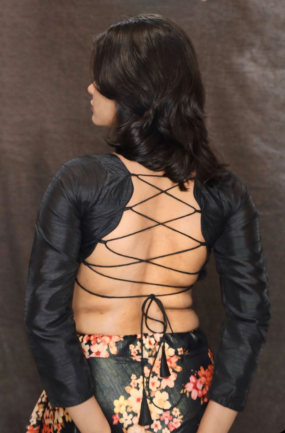 Black Backless Blouse In Velvet With Criss-Cross Tie-Up
