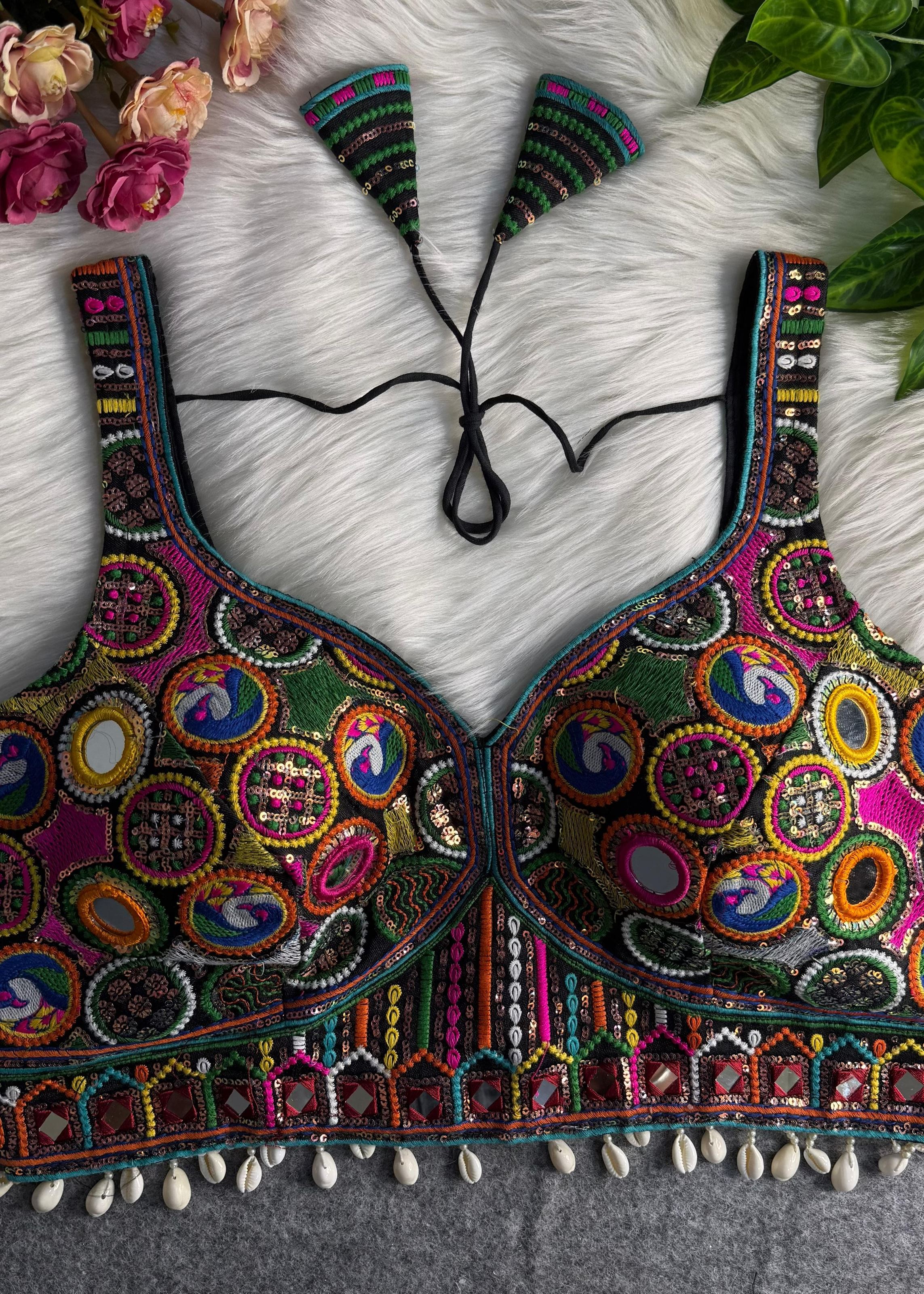 Black Gamthi Navratri Blouse with Mirror Work & Shell Tassels