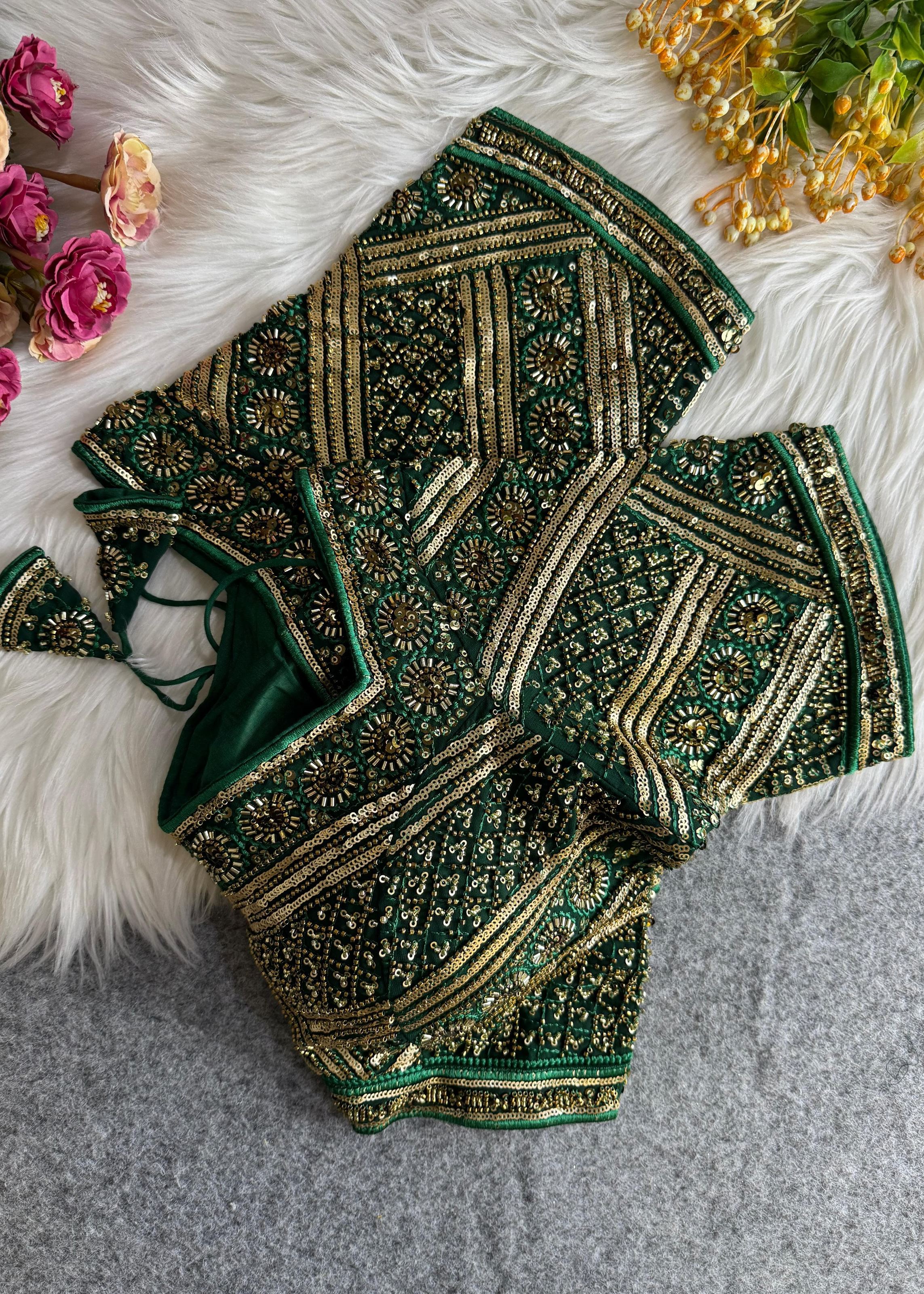 Bottle Green Handcrafted Royal Saree Blouse with Zari & Mirror Work