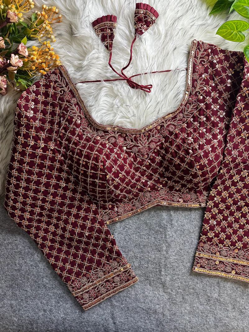 Make an unforgettable impression with the Dark Maroon Bridal Blouse with Full Sleeves, U-Neck & Heavy Floral Sequin Work, an opulent creation from Aethnofit Fashions. Crafted from rich georgette fabric, this blouse features exquisite floral embroidery intricately highlighted with dense sequin embellishments. The deep maroon hue brings out a timeless bridal elegance, ideal for receptions, sangeet nights, and grand festive celebrations.