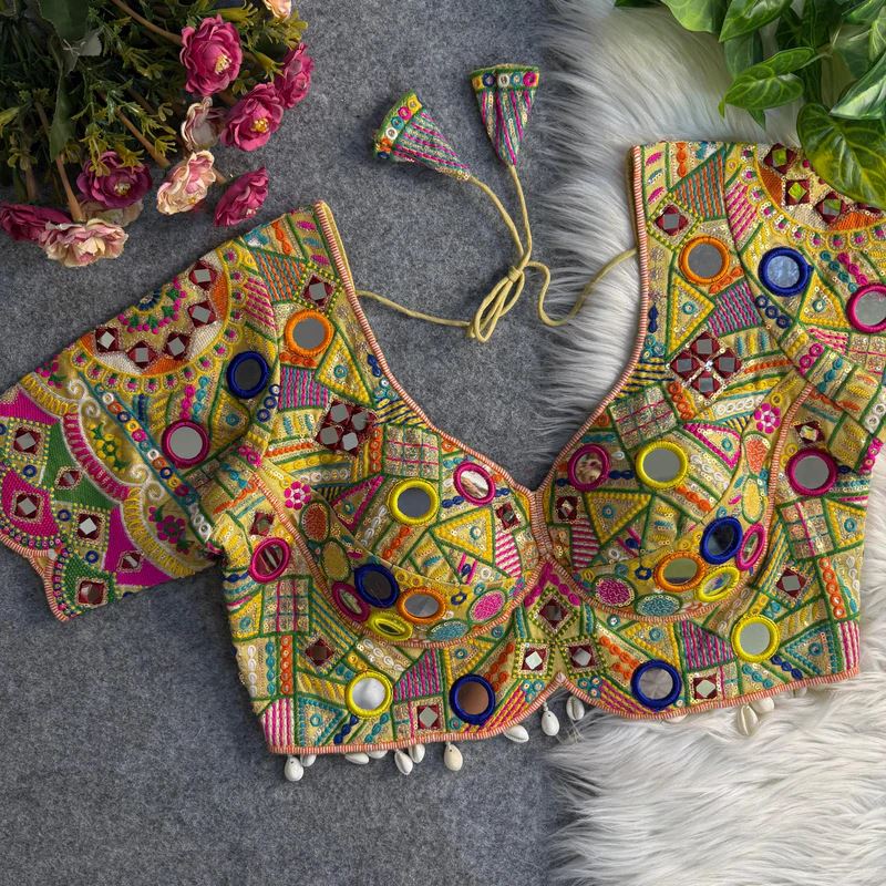 Shine bright this festive season with the Golden Gamthi Navratri Blouse from Aethnofit Fashions—a statement piece where heritage meets celebration. Crafted from soft silk fabric, this blouse features exquisite mirror work inspired by traditional Gamthi embroidery, paired with a flattering sweetheart neckline that adds elegance and charm to your ethnic ensemble.