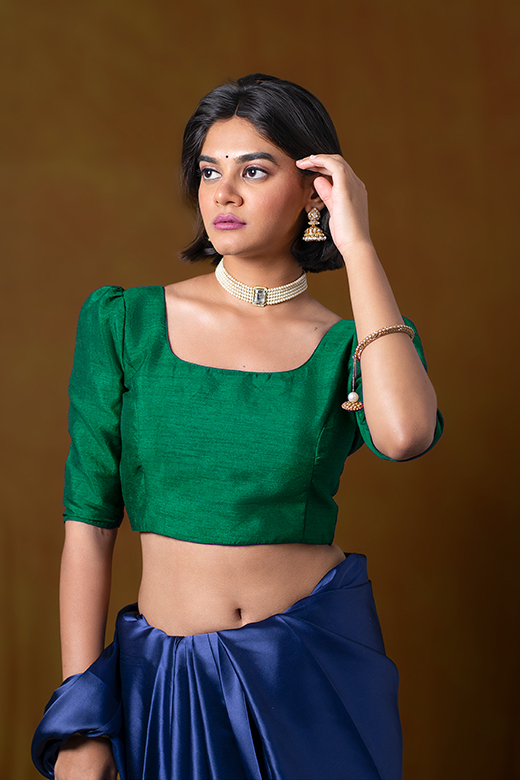 Green Blouse in Art Silk with Puff Shoulders And Half Sleeves