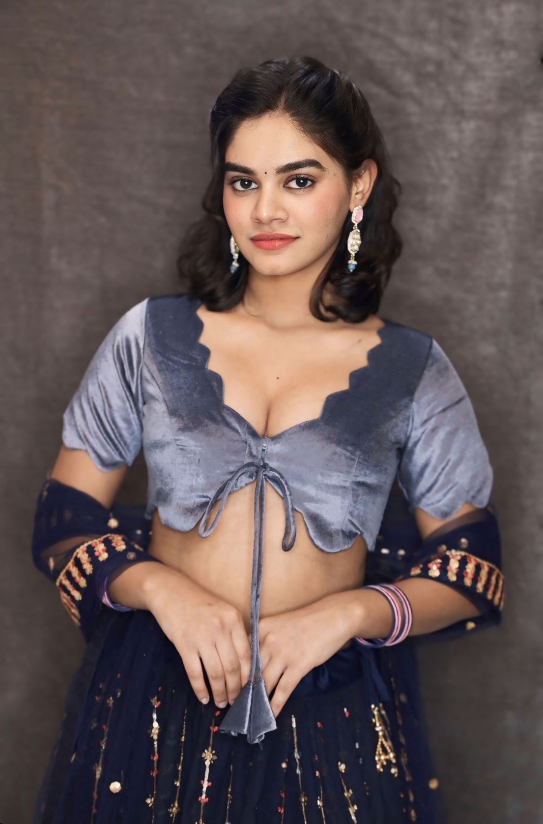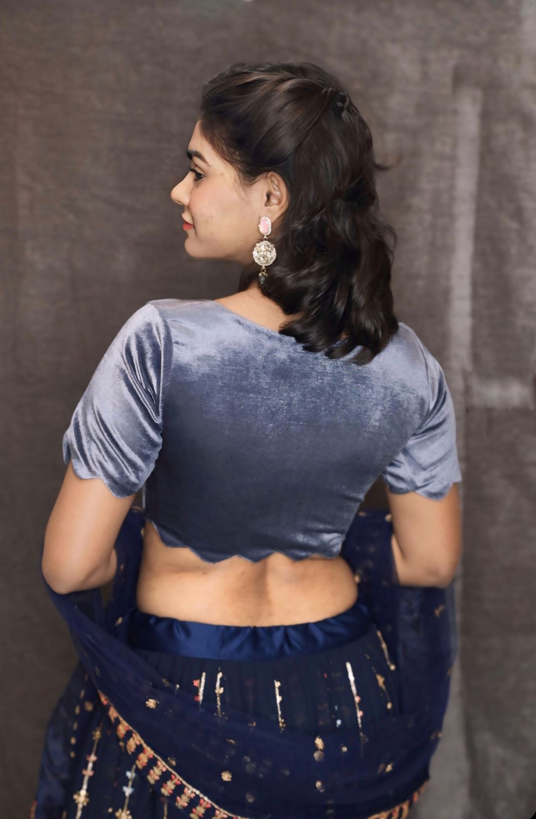 Grey Velvet Blouse in a Scalloped Neckline With Tie Up Tassels Dori