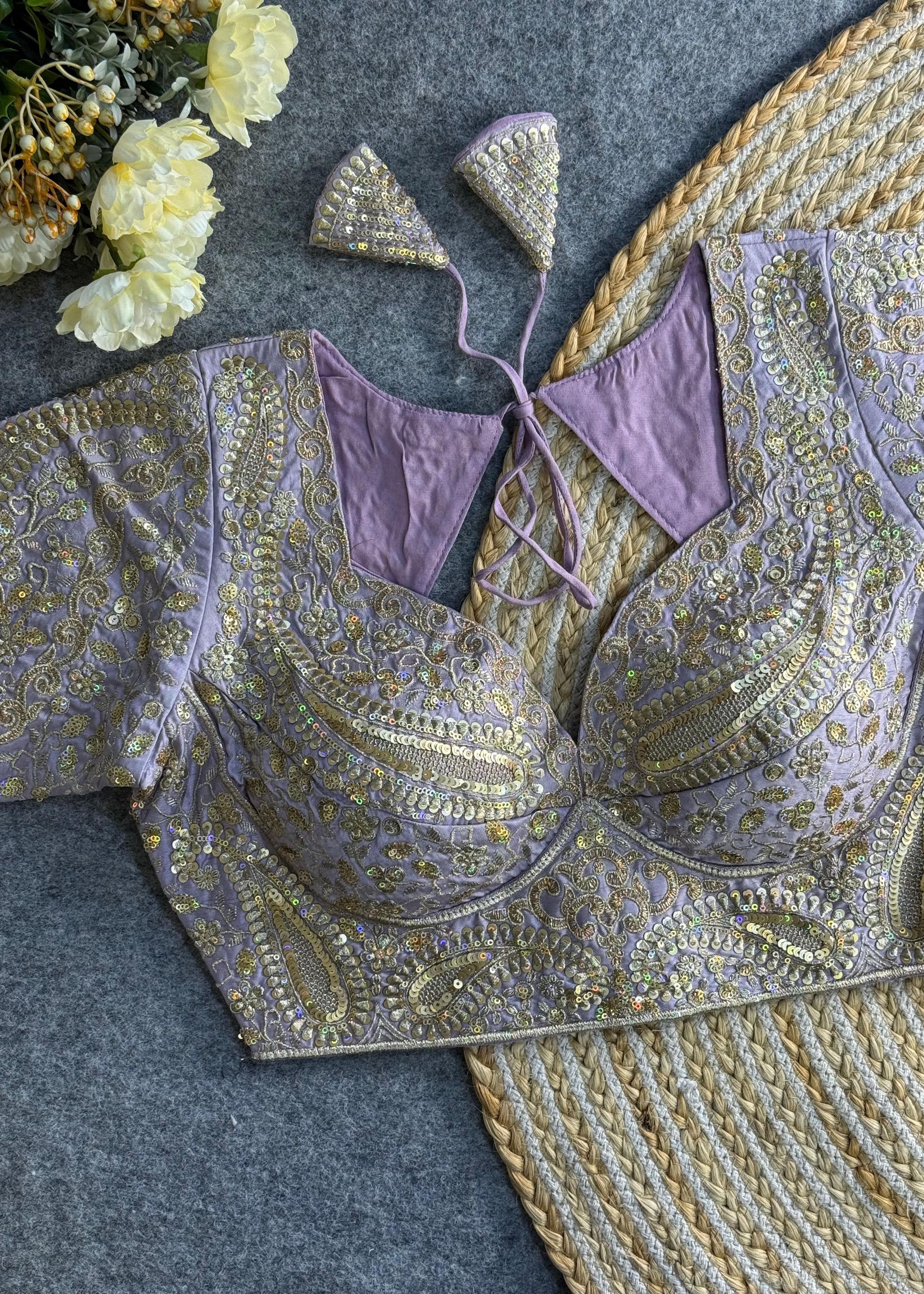 The graceful lavender tone offers a modern alternative to bold bridal hues, perfect for daytime events, haldi ceremonies, or elegant pre-wedding functions. The deep V-neckline adds a contemporary silhouette, giving the blouse a refined structure that pairs effortlessly with lehengas, sarees, or festive chaniya cholis.