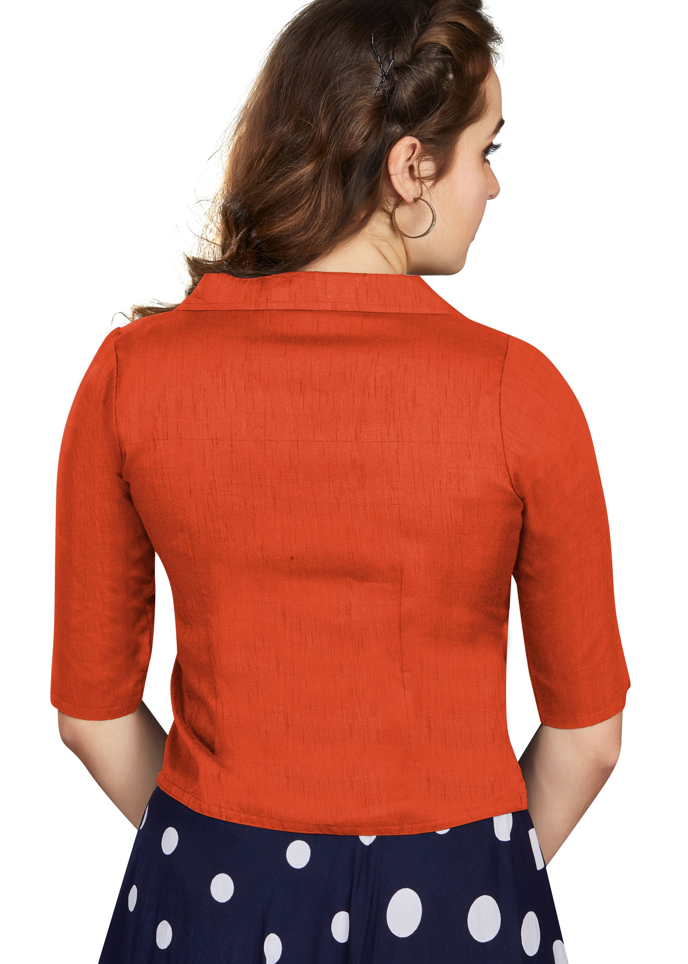 For those looking to buy designer readymade blouses online in the USA, Aethnofit Fashions offers this versatile piece as a wardrobe staple. With its vibrant hue, silky texture, and timeless silhouette, the Orange Art Silk Collar Neck Blouse is the perfect blend of tradition and modernity — designed to make you stand out while staying comfortably stylish.