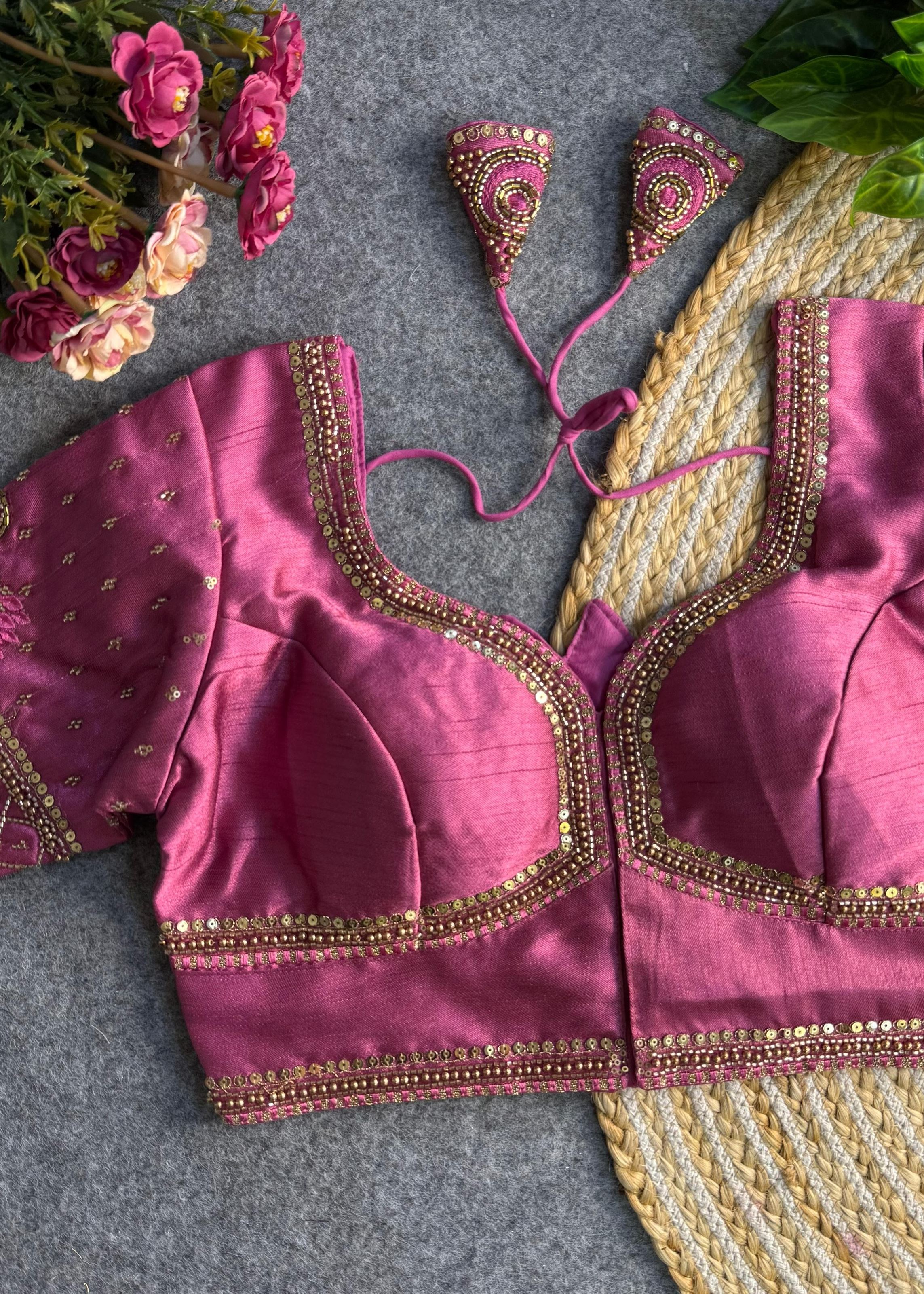 The soft peach hue adds a subtle charm, perfect for brides who want something delicate yet regal. Ideal for festive wear, wedding functions, or Garba celebrations, this blouse pairs beautifully with embroidered lehengas or silk sarees, offering a refined ethnic look for any occasion.