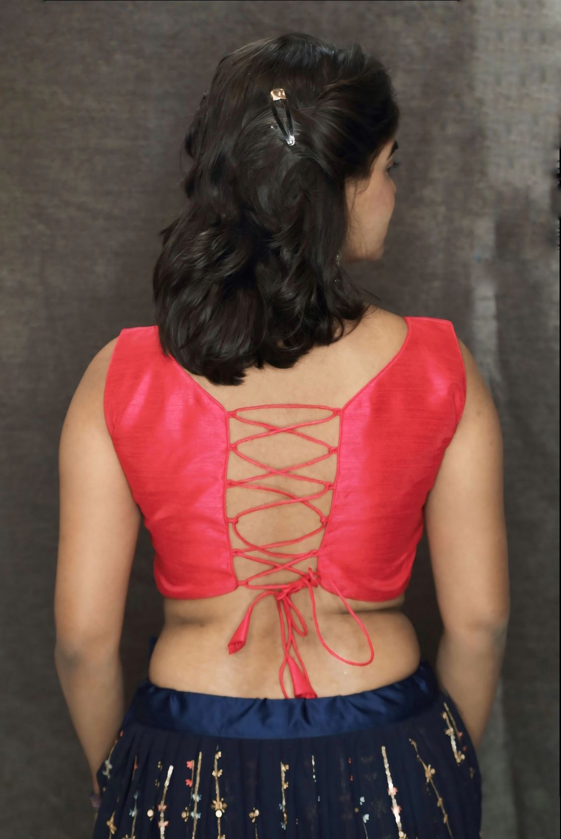 Pink Blouse In Art Silk With Sequins Work, Sheer Center Cut Out And Criss-Cross Tie Up Back