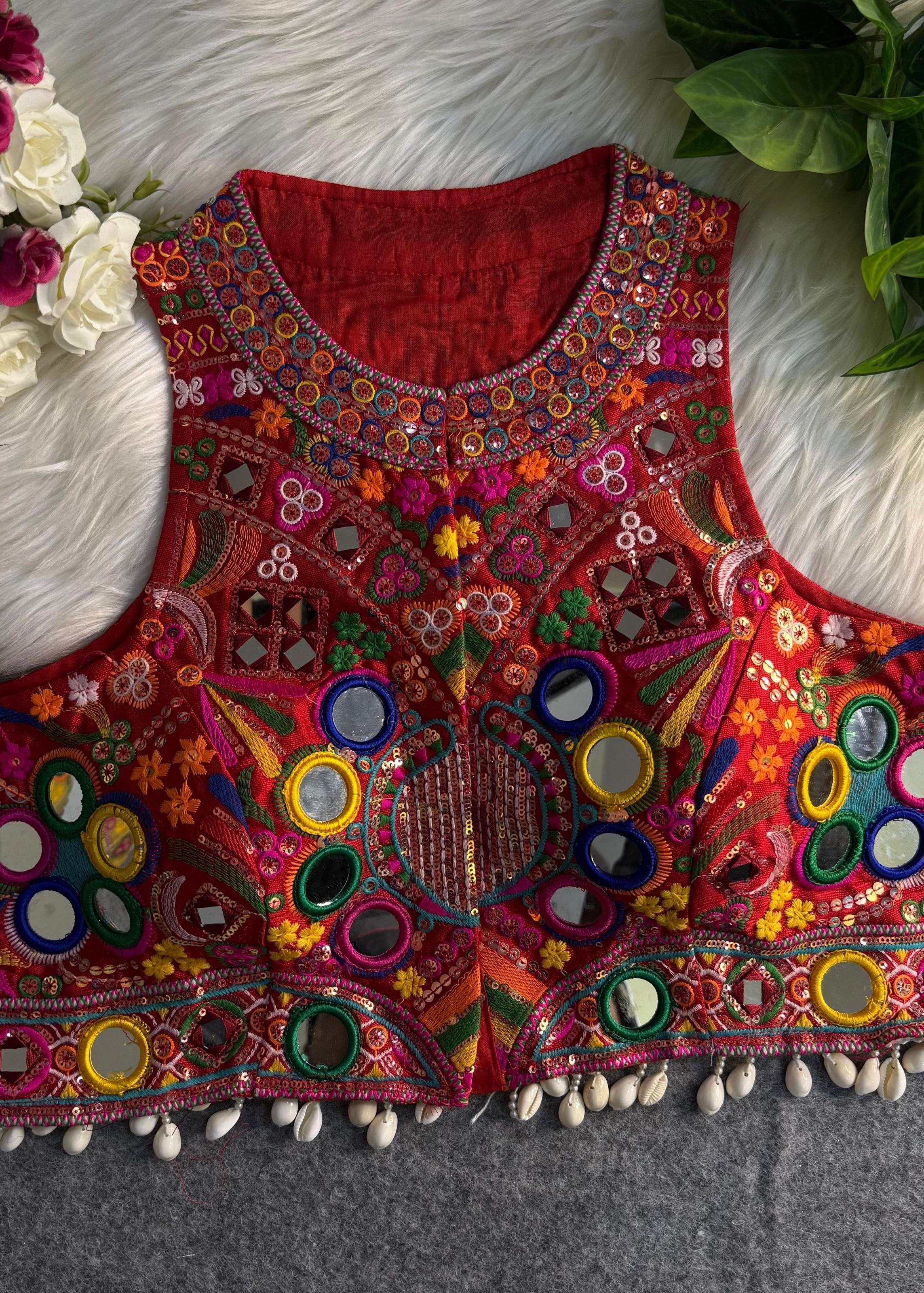 Add a pop of festive elegance to your ethnic wardrobe with the Pink Round Neck Navratri Blouse from Aethnofit Fashions. Crafted from premium silk, this blouse is adorned with authentic Gamthi embroidery, radiant mirror work, and charming shell tassels. The rounded neckline adds a soft, feminine finish, making it a versatile match for lehengas and traditional chaniya cholis.