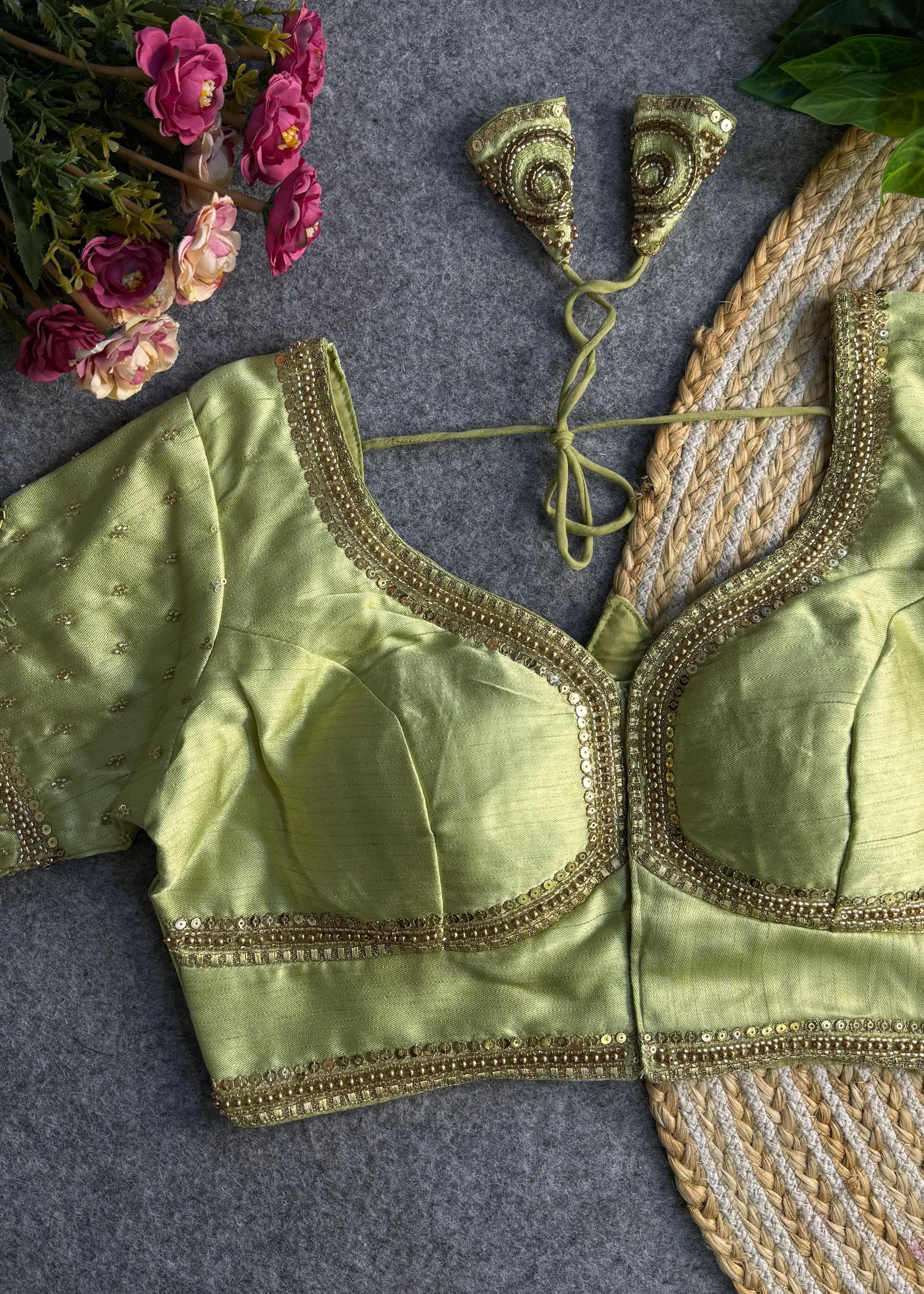 The soothing pista green tone offers a refreshing yet regal touch, making it an excellent choice for bridal wear, Garba nights, festive celebrations, and traditional ceremonies. Designed to complement lehengas or sarees, this blouse enhances your ethnic look with subtle sophistication and effortless grace.