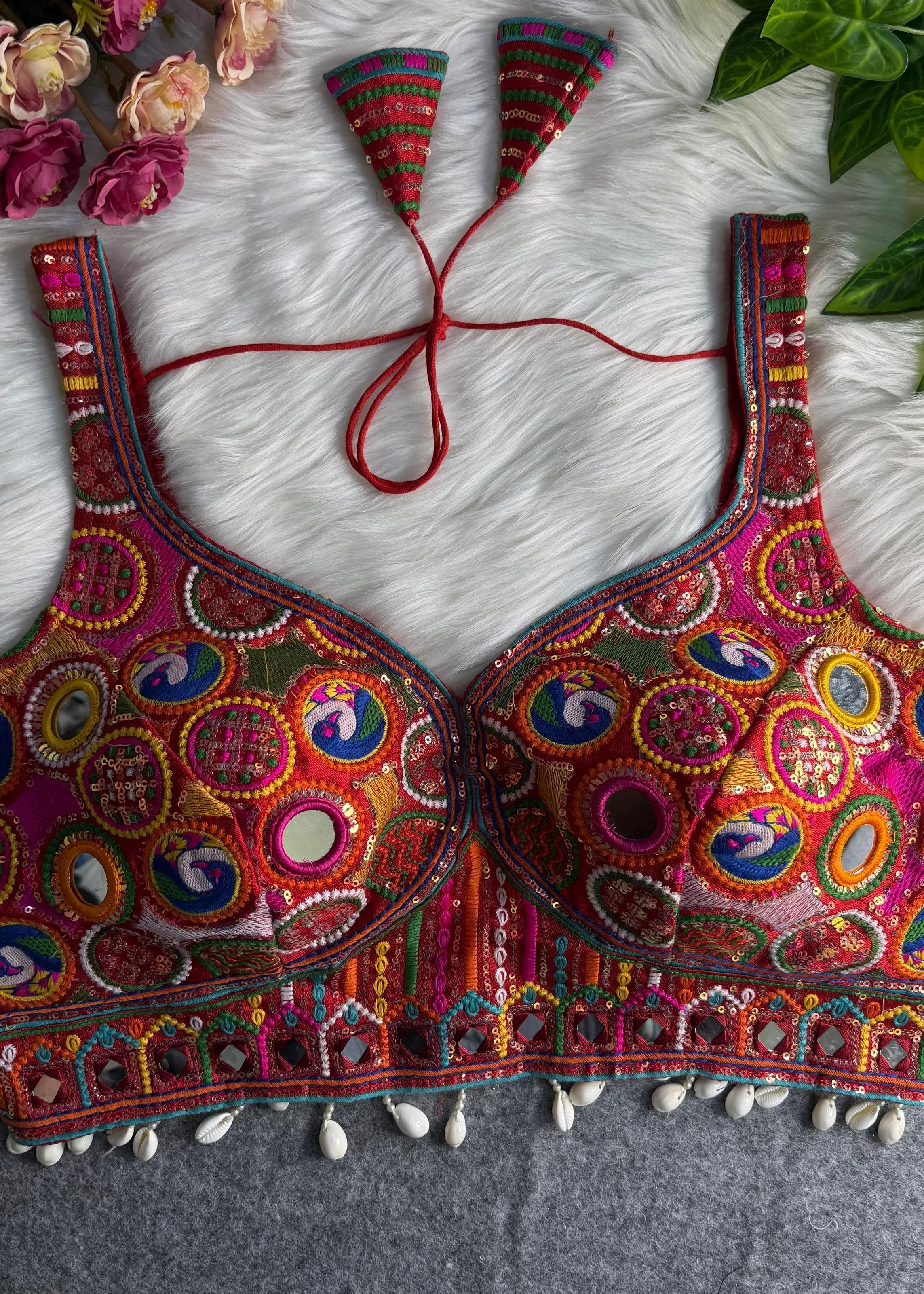 Red Gamthi Navratri Blouse with Mirror Work Shell Tassels