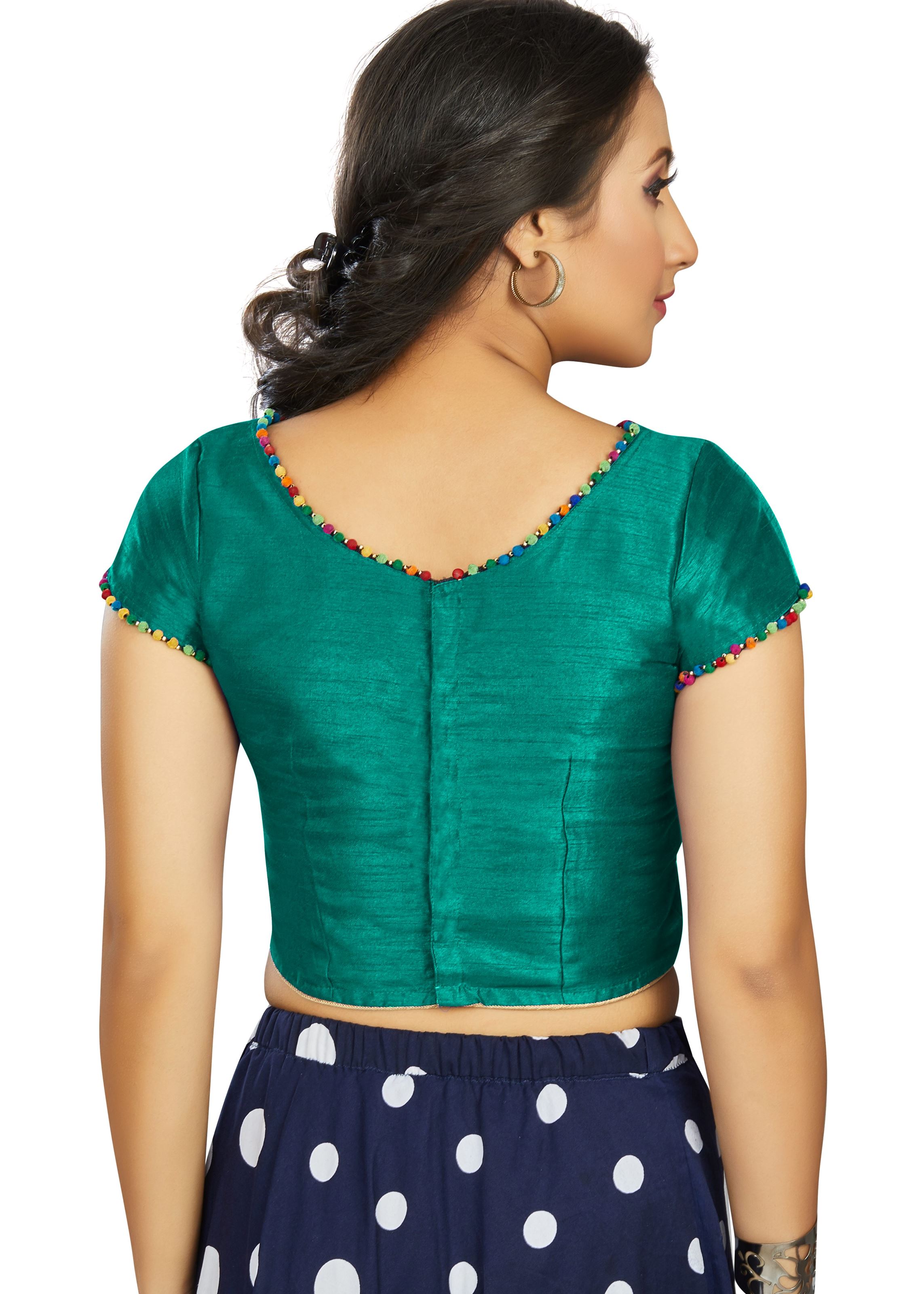 The refreshing sea green hue exudes calmness and grace, making it an ideal pick for daytime celebrations, weddings, receptions, or spiritual ceremonies. Designed with a classic boat neckline, this blouse beautifully frames the collarbone while offering a flattering fit that complements both traditional and contemporary drapes.