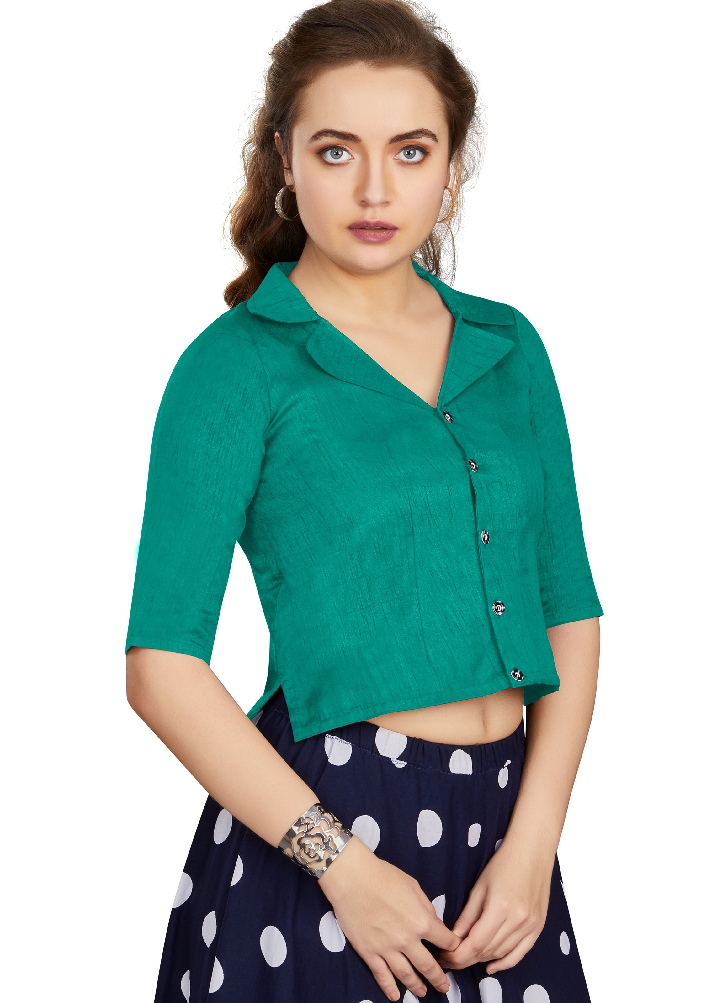 Refresh your ethnic wardrobe with the Sea Green Art Silk Collar Neck Plain Blouse from Aethnofit Fashions. Made with premium art silk, this blouse offers a lightweight feel and subtle sheen that adds instant elegance. The calm sea green hue strikes a perfect balance between understated grace and versatile styling, making it ideal for festive, casual, or office-ready Indian ensembles.
