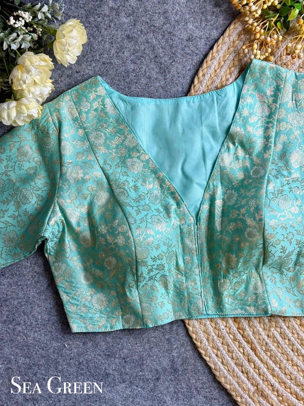 Refresh your festive wardrobe with the elegant charm of the Sea Green Designer Blouse with V-Neck & Golden Brocade Floral Weave, exclusively from Aethnofit Fashions. Crafted from a high-quality silk blend fabric, this blouse features a luxurious golden brocade floral weave that adds rich texture and traditional flair. The structured V-neckline offers a flattering modern silhouette, making it perfect for versatile ethnic styling.