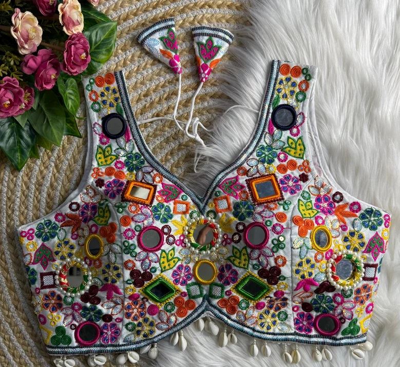 The serene white tone offers unmatched versatility—pair it effortlessly with bold or pastel lehengas, sarees, or Navratri skirts for a complete festive ensemble. Whether you're dancing under the dandiya lights or attending traditional functions, this blouse blends culture and chic sophistication with every stitch.
