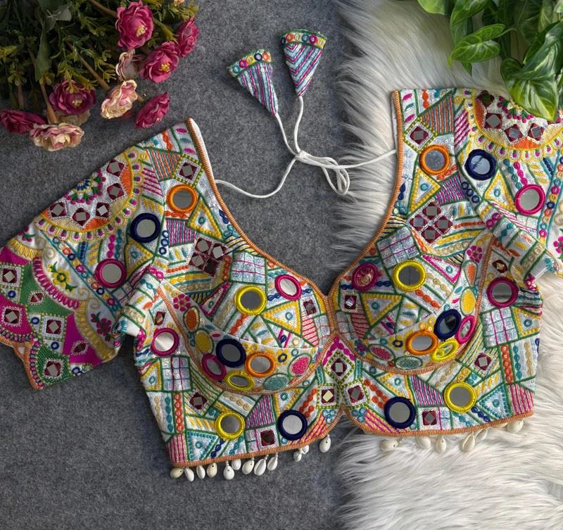 White Gamthi Navratri Blouse with Sweetheart Neck & Mirror Work
