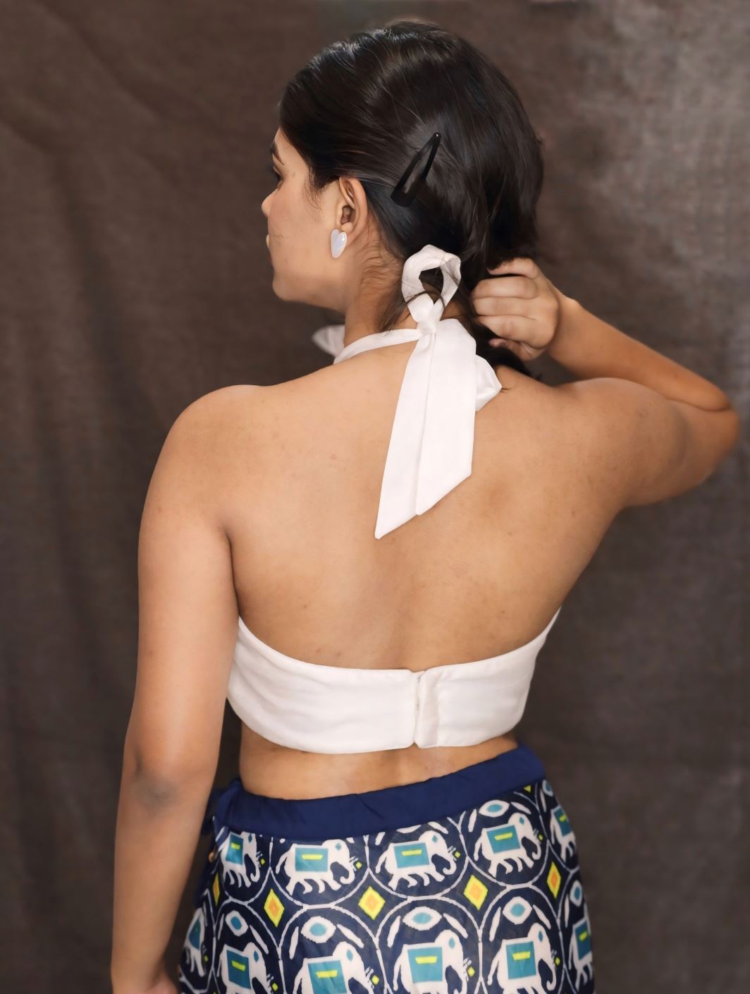 White Halter Neck Blouse with a sheer High Neckline and Sweetheart Shaped Bodice